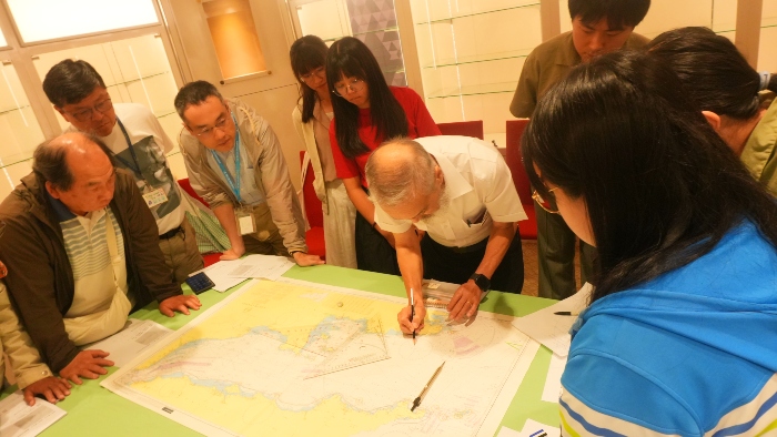 船が安全に航行できるよう、水深や海岸の地形などを記載した“海の地図”である「海図」。パシフィック・ワールド号では、豊富な航海経験をもつ事務局長が、毎日手書きで海図に船の現在地を書き入れています。今日は参加者の方に向けた海図の書き方講座が行われ、事務局長のレクチャーを受けながら定規やコンパスを使って、皆さん熱心に海図の書き込みに取り組んでいました。