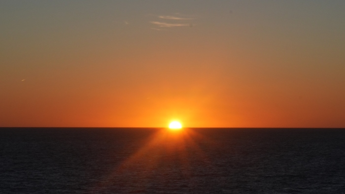洋上から、水平線の向こうへと沈みゆく夕日を眺めていると、時間の経過が生む美しい変化に魅入ってしまいます。日暮れが迫り、オレンジ色の空が少しずつ夜の闇に包まれてゆくさまは、例えようのない神秘的な光景――世界の海を渡る船の上で、この上ないぜいたくな時間が過ぎてゆきます。