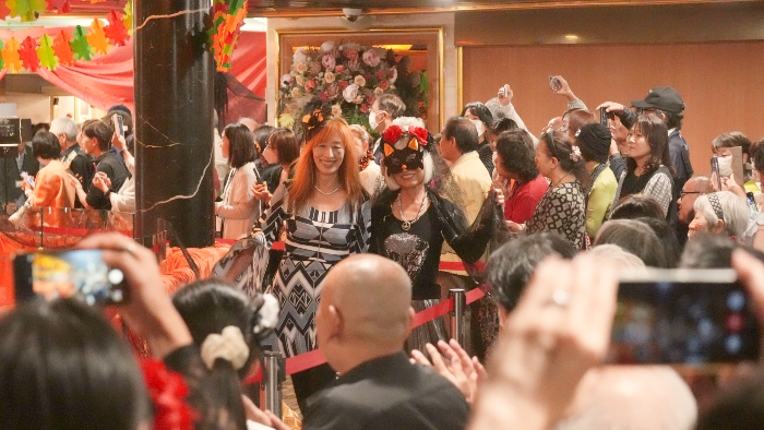 船旅らしいイベントのひとつであるクルージングパーティー。この日は季節にちなんだ「ハロウィン」がテーマのパーティーが開催され、船内各所でさまざまな催しが行われました。フェイスペイントやお菓子の交換会、ちょっぴり怖くてワクワクするような衣装を身にまとった参加者がランウェイを歩くハロウィンファッションショーや、思い思いの仮装で踊るダンスパーティーなど、船内は楽しく華やかな雰囲気に包まれました。