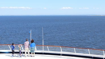オーロラベルト圏内を航行中のパシフィック・ワールド号の船上で、待ちに待ったオーロラを観測しました。船の前方から後方へと光をのばしてゆく緑のオーロラ――写真や映像ではなく自分の目で眺めるオーロラは、とても神秘的で感動的でした。船のデッキには大勢の人が集まり、夜空で舞い踊る光のヴェール・オーロラを目に焼きつけていました。