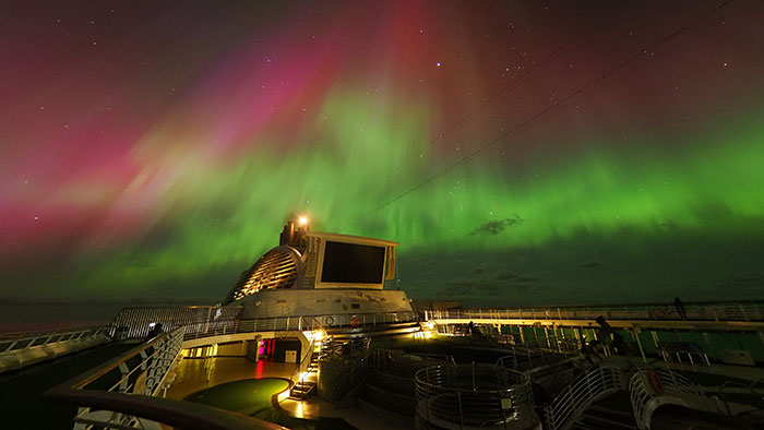 そして、今クルーズのハイライトであるオーロラシーズンのアイスランドへ。待ちに待ったオーロラが現れると、誰もが心を奪われ、感動的で神秘的な夜の風景を眺めていました。夜空に広がる神秘的な光の舞はとても幻想的で、忘れられない旅の思い出となりました。