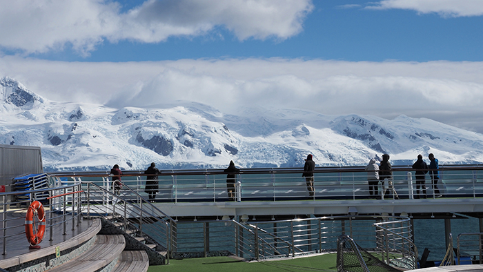 壮大な山々と美しい氷の世界が広がる神秘の大陸、南極。地球が創り出した青と白の絶景を心に焼き付けようと、多くの人がデッキや窓辺に佇み、その素晴らしい光景に時間を忘れて見入っていました。