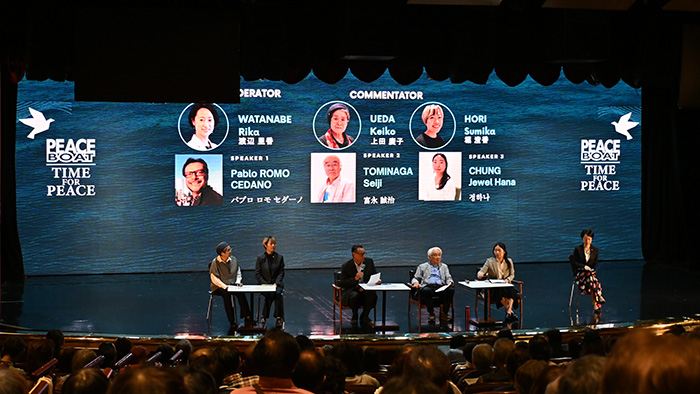 戦後80周年を迎える本年、世界の平和を改めて希求するピースボートの特別プロジェクト「TIME FOR PEACE」が船内でも実施されました。2024年のノーベル平和賞を受賞した日本被団協や2017年のノーベル平和賞受賞団体であるICAN(核兵器廃絶国際キャンペーン)のメンバーも船にお迎えし、旅をとおして平和について学び、考える時間となりました。
