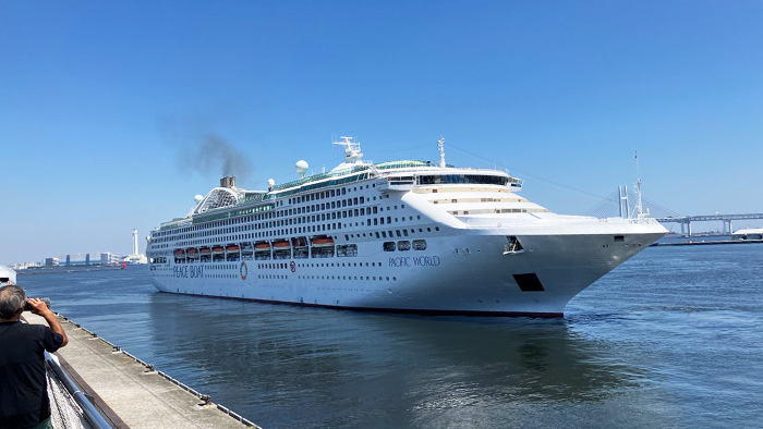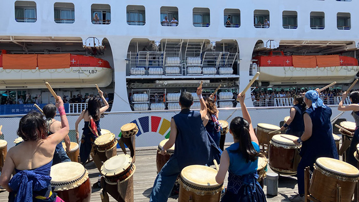 出航を祝う和太鼓のパフォーマンスが披露され、送迎デッキはお見送りの方々が手を振ったり、連絡を取り合ったりとにぎやかな雰囲気に包まれています。 そして迎えた出航の時。「いってきます!」「いってらっしゃい!」そんな声があちらこちらから聞こえる中、パシフィック・ワールド号はゆっくりと岸を離れていきます。いよいよ待ちに待った世界一周クルーズの幕開けです。