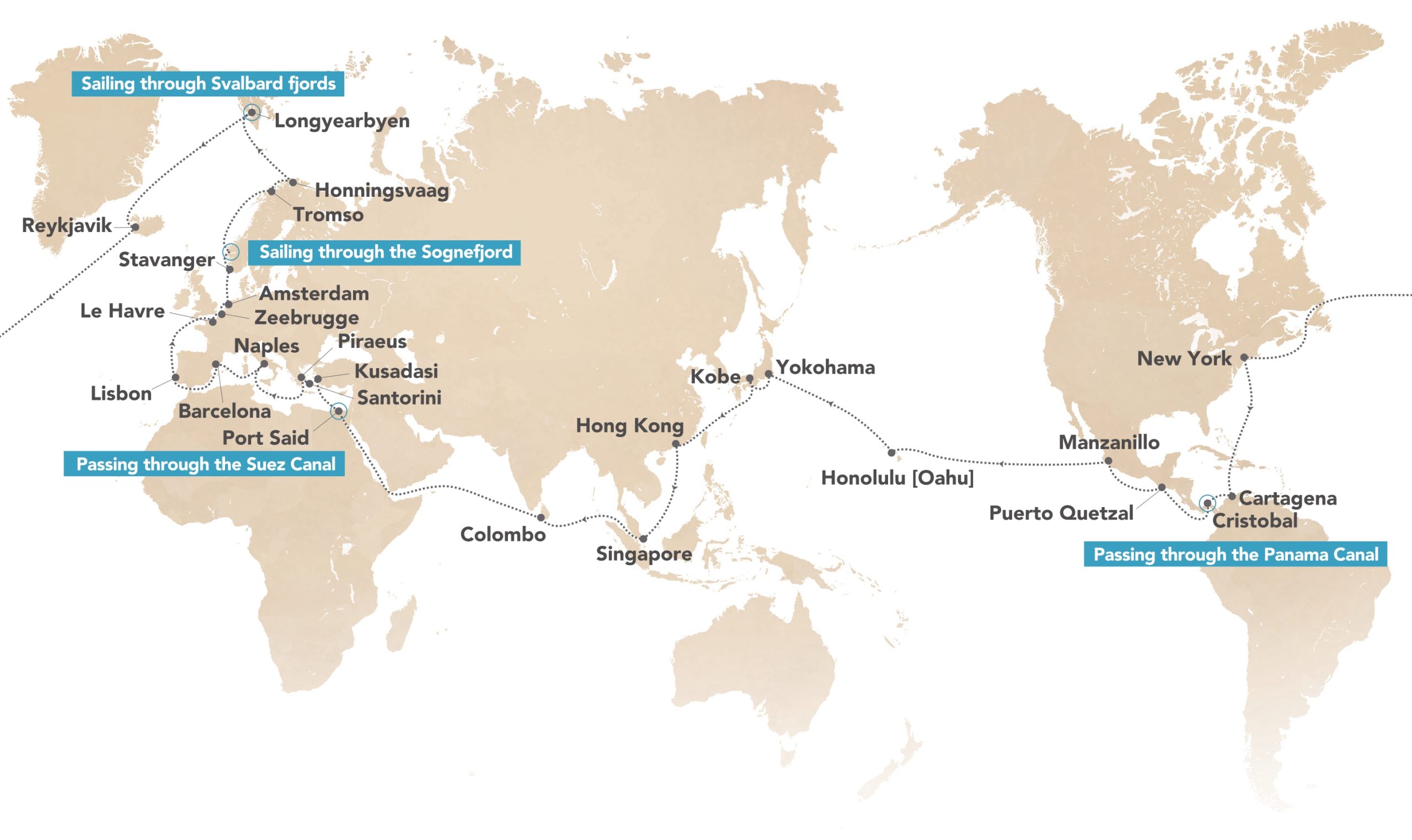 Amidst the grand landscapes of the far north, this cruise visits three ports in the Arctic Circle and the fjords in Svalbard. Additionally, we will be stopping in Egypt and Turkey to explore their ancient ruins, numerous European countries renowned for their world heritage sites, and popular destinations such as New York and Honolulu.