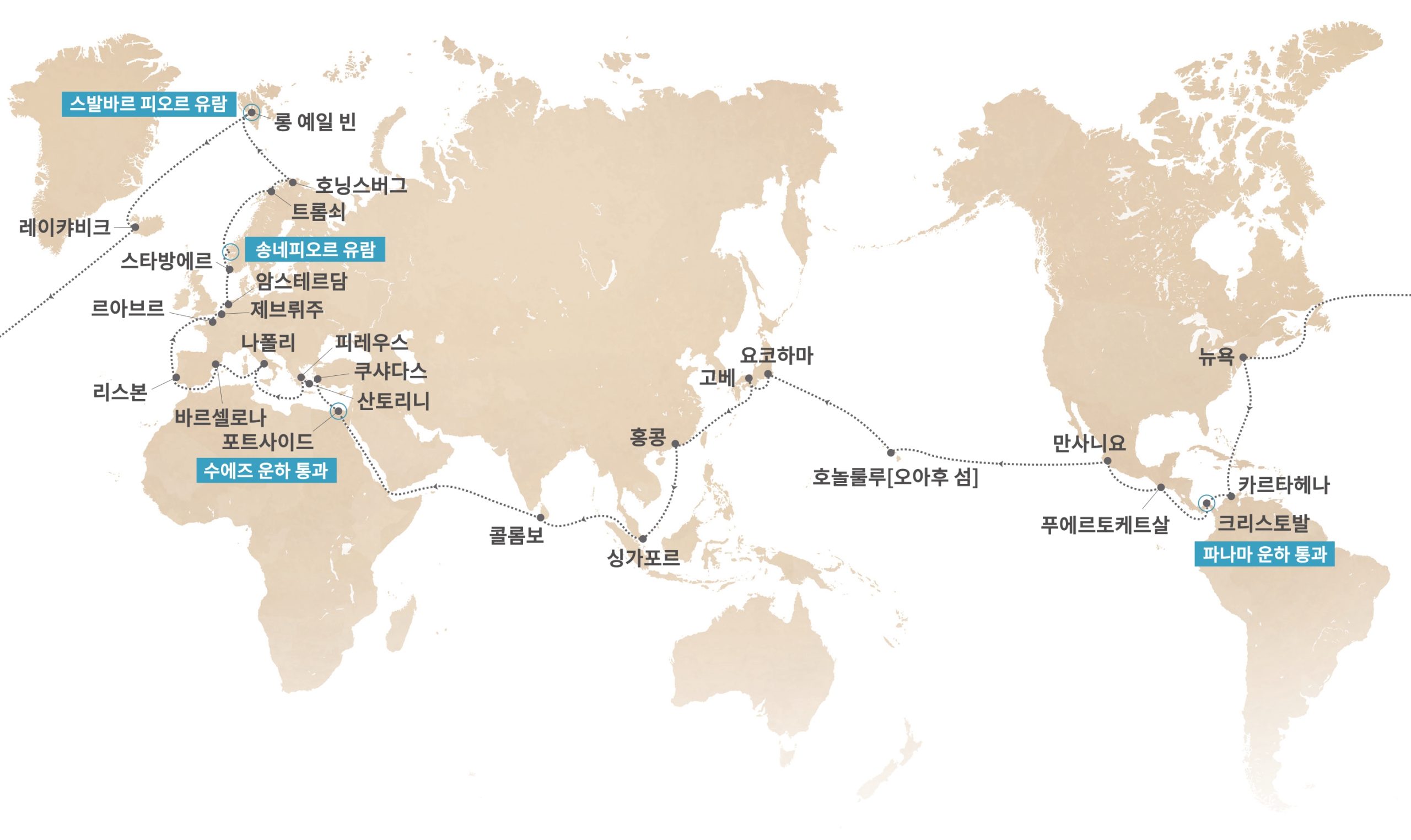 이번 크루즈에서는 북극권에 위치한 3곳의 도시에 기항하고 웅장한 얼음 세계가 펼쳐지는 스발바르 피오르를 유람합니다. 또한, 고대 유적이 고스란히 남아 있는 이집트와 튀르키예, 누구나 동경하는 세계유산의 보고인 유럽 국가들, 뉴욕, 호놀룰루 등 인기 있는 기항지를 방문하는 볼거리 가득한 크루즈입니다.