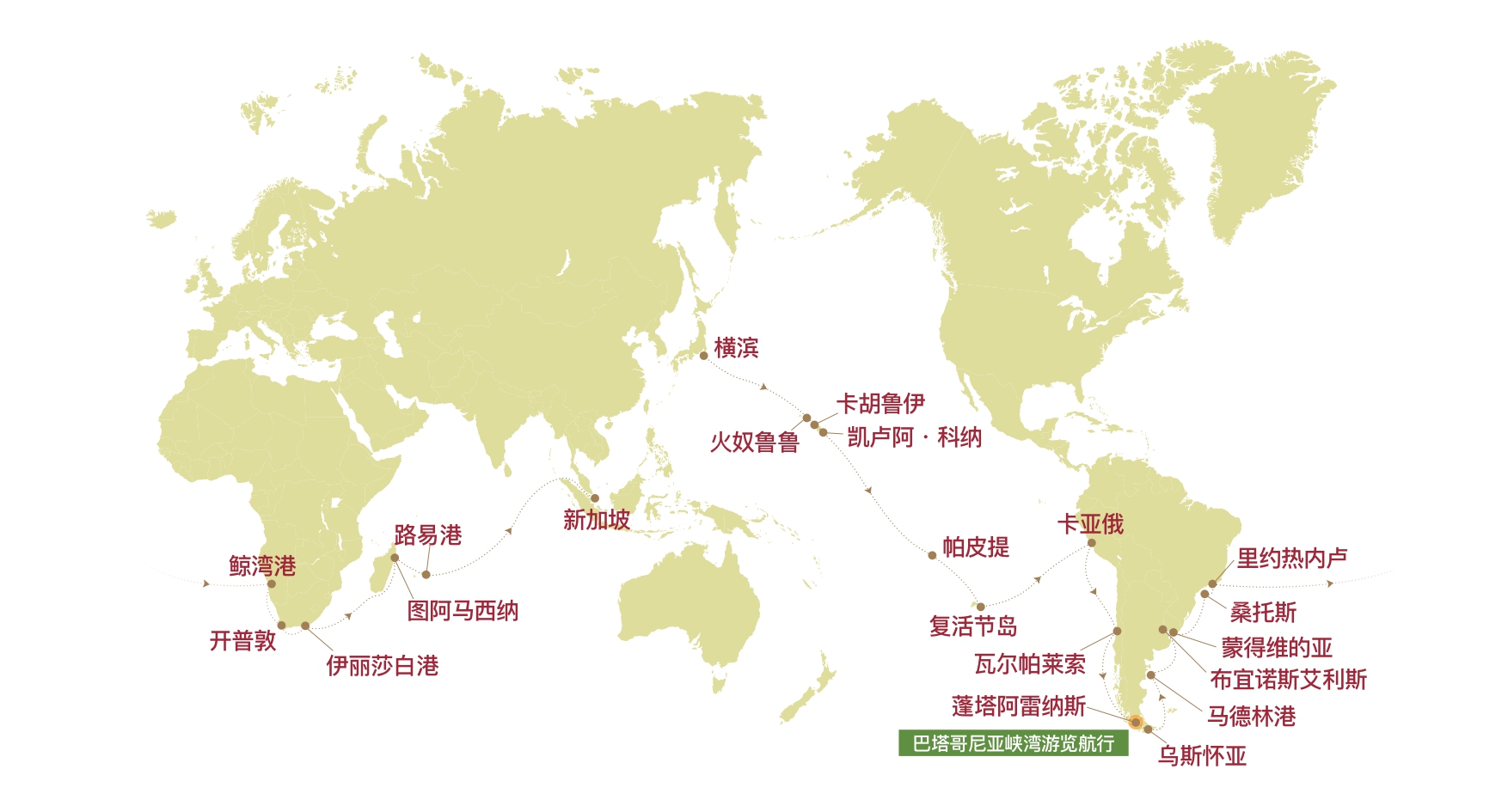 南半球之旅。此航程也会引领您造访许多历经悠久历史而行程的壮丽景观。从人类起源的非洲大陆到最晚抵达的南美大陆南端、最后到自古以来文明的交汇地,这段旅程將帶您探寻先人的足迹。