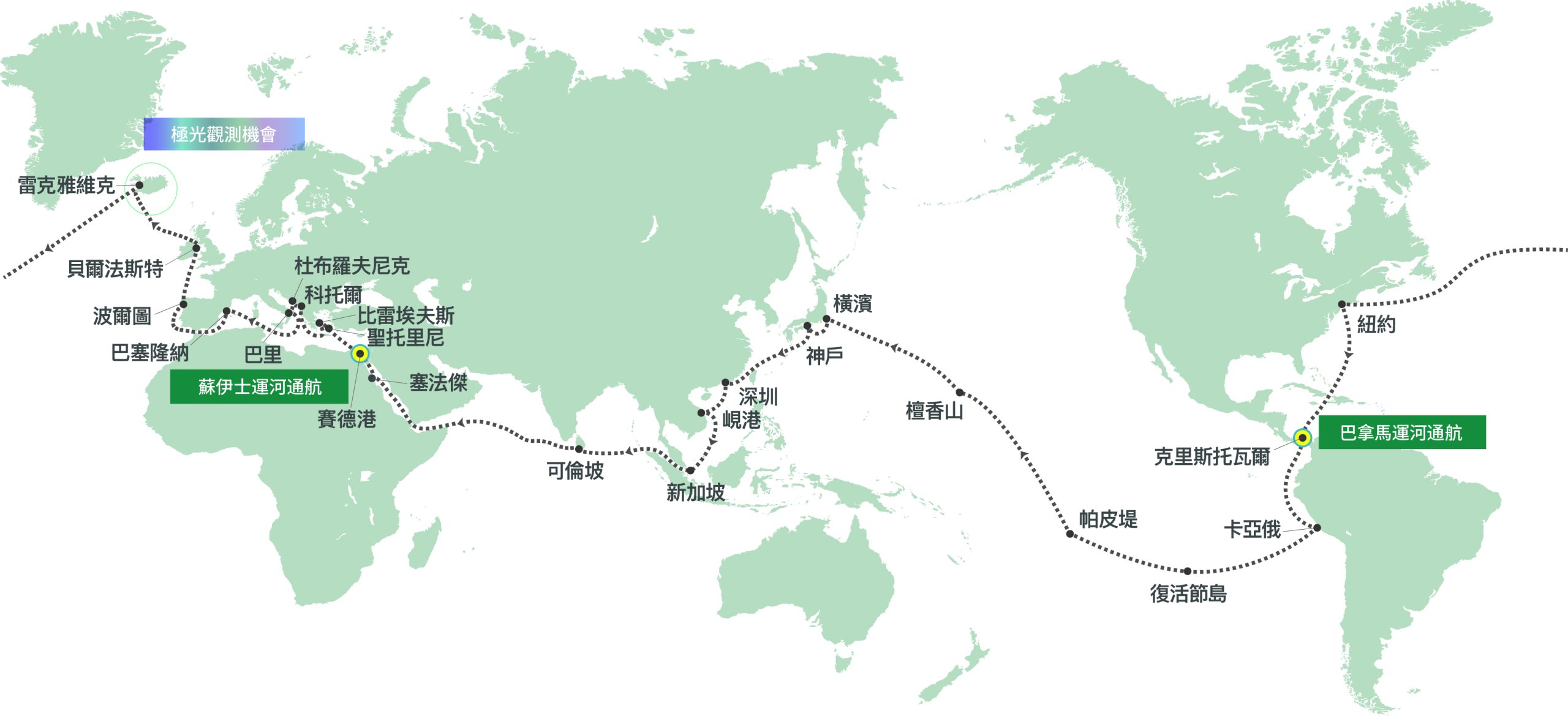 本次航程的停靠港口不勝枚數,從杜布羅夫尼克和科托爾等波光粼粼的亞得里亞海港口城市,到埃及、秘魯和復活節島等擁有古城遺址的熱門國家 。 本次航程的亮點之一是從船上觀賞極光!