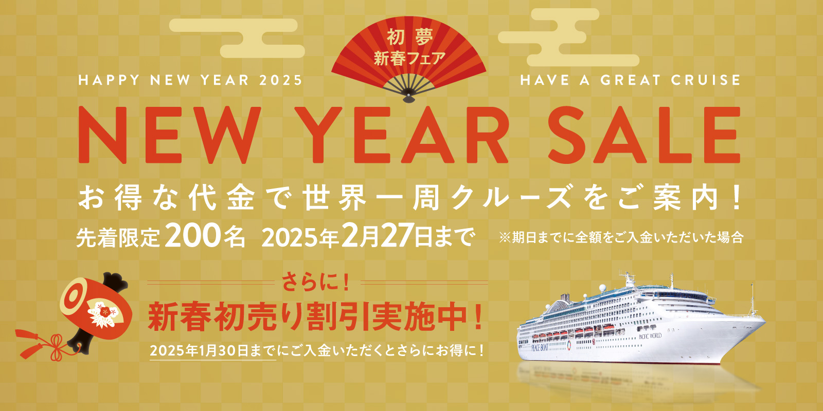 1月30日(木)までに代金をご入金いただいたみなさまには、2月27日(木)締切の早得割引から、さらに新春初売り割引も適用いたします。ぜひこの機会にご検討ください。※新春初売り割引は、2025年1月30日(木)午後2時までに旅行代金の全額をご入金いただいた場合に適用されます。(詳しくは資料をご請求ください。)