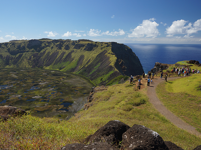 イースター島といえば、島内のあちこちにたたずむモアイ像を思い浮かべる方が多いかもしれませんが、独特な色合いの美しい海も大きな魅力です。イースター島は海底火山からマグマが噴出してできた火山島で、深い海底から頂上部分のみが海上に露出しているため、島の海岸線は断崖絶壁か岩場ばかりです。急激に海が深くなるため、島の周囲には、タヒチなどの海と比べて濃い、独特の群青色をした海が広がっています。また、オロンゴ岬の隣にそびえるラノ・カウ火山からの雄大な眺めも、非常にフォトジェニックです。