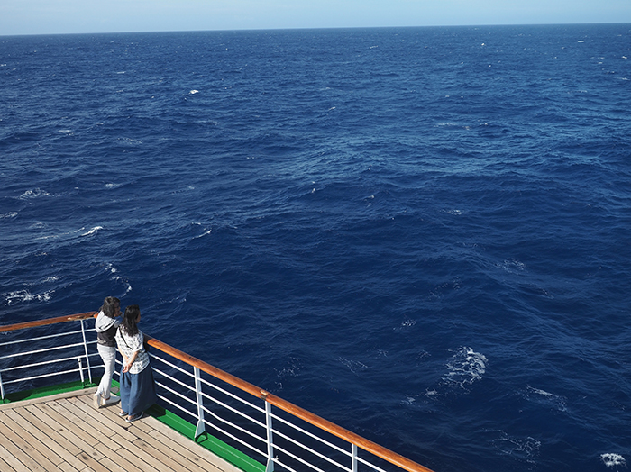地球表面の約3分の1を占める太平洋は、地球上でもっとも広い海で、オーストラリアやニュージーランド、たくさんの島々があるにしても、そのエリアのほとんどは陸地ではなく海面が占めています。そんな海の大きさ、あるいは地球の大きさをじかに感じられるのは、船旅ならではの豊かな体験です。空の青と海の青、視界の限り続く『青』の世界に360度包まれた広大な海をのんびりと進むひとときは、何物にも代えがたい贅沢な時間。デッキから望む大海原や青空は、どれだけ見ていても見飽きることはありません。