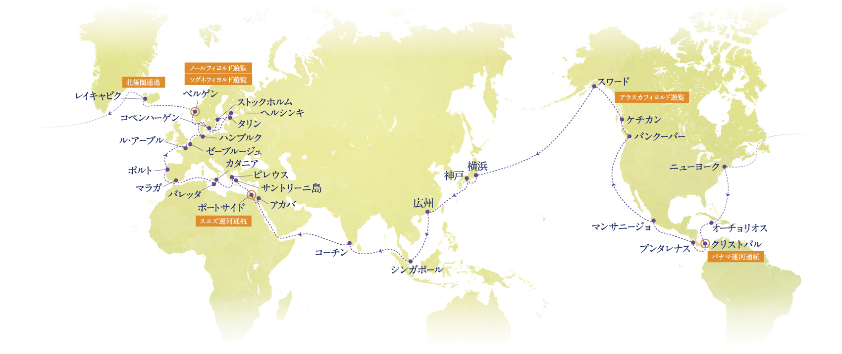 1995年、イタリアで当時最大の客船として竣工。外国客船による日本周遊クルーズを2年連続で実施し、外国客船による国内クルーズブームの火付け役として寄与。大規模改修を経て、2019年に日本発着の世界一周クルーズを実施しました。数多くのバルコニー付き船室を備え、多数の設備と充実のサービスが魅力のパシフィック・ワールド号には、ただの移動手段ではない「船上での生活」や、この旅にしかない出会い、発見、学びなど多くの魅力が詰まっています。