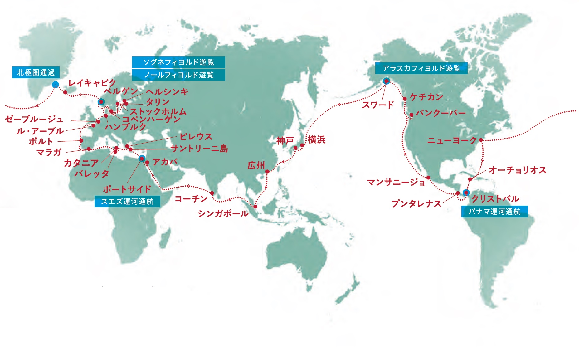 横浜 神戸 広州(中国) シンガポール コーチン(インド) アカバ(ヨルダン) スエズ運河通航 ポートサイド(エジプト) サントリーニ島(ギリシャ) ピレウス(ギリシャ) カタニア(イタリア) バレッタ(マルタ) マラガ(スペイン) ポルト(ポルトガル) ル・アーブル(フランス) ゼーブルージュ(ベルギー) ハンブルク(ドイツ) ストックホルム(スウェーデン) タリン(エストニア) ヘルシンキ(フィンランド) コペンハーゲン(デンマーク) ベルゲン(ノルウェー) ソグネフィヨルド遊覧 ノールフィヨルド遊覧 レイキャビク(アイスランド) 北極圏通過 ニューヨーク(米国) オーチョリオス(ジャマイカ) クリストバル(パナマ) パナマ運河通航 プンタレナス(コスタリカ) マンサニージョ(メキシコ) バンクーバー(カナダ) ケチカン(米国) アラスカフィヨルド遊覧 スワード(米国) 横浜 神戸