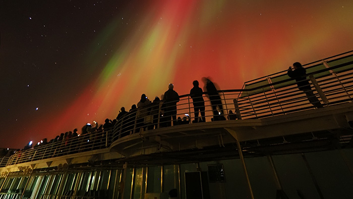 普段は船室のバルコニーでお茶を飲みながら、ゆったり過ごすのが好きでした。海を見ながらくつろげて、縁側のような使い方もできますし。あと、船にはお寿司屋さんもあるんですよ。外からもよく見えるので、知っている人が通るたびに「ちょっとおいで~」と誘ってしまうことも(笑)。でも美味しいお寿司を食べながらいろんな話ができて、楽しかったですね。オーロラ鑑賞も楽しみのひとつでしたが、オーロラを待つ間もホットワインを飲みながら、その場で仲良くなった方とお話しできたことが良い思い出です。