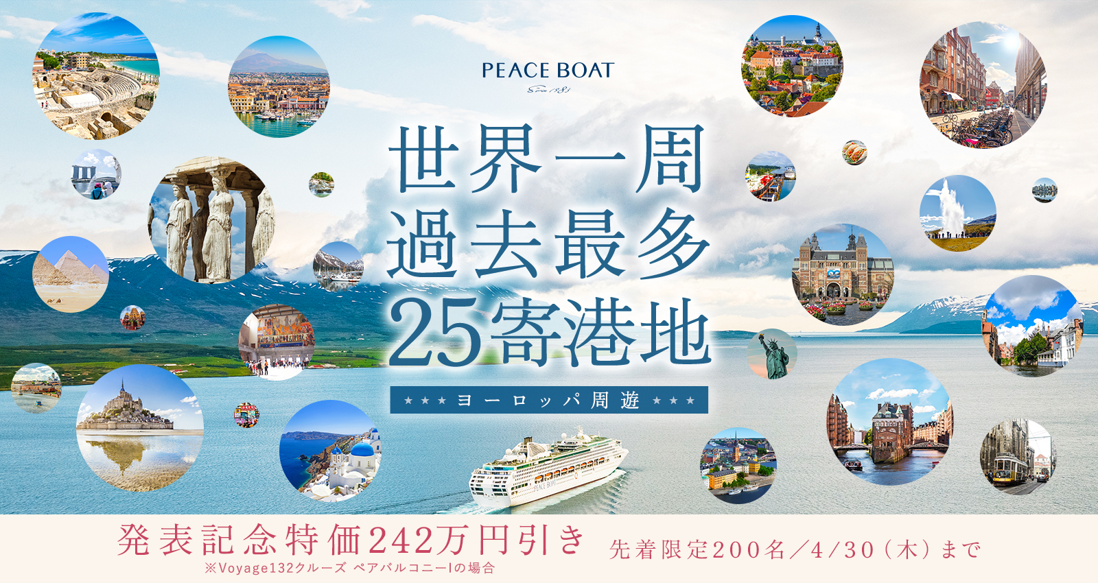 多彩な魅力にあふれる香港を皮切りに、三大ピラミッドが待つポートサイド(エジプト)、古代文明の面影が色濃く残るピレウス(ギリシャ)、地中海の陽光に包まれたタラゴナ(スペイン)、中世の趣を今に伝えるゼーブルージュ(ベルギー)、洗練された芸術文化が息づくオスロ(ノルウェー)、世界遺産の街タリン(エストニア)、雄大な自然が広がるクリストバル(パナマ)へ。歴史や文化、そして大自然が連なる、心躍る寄港地の数々をお楽しみください。