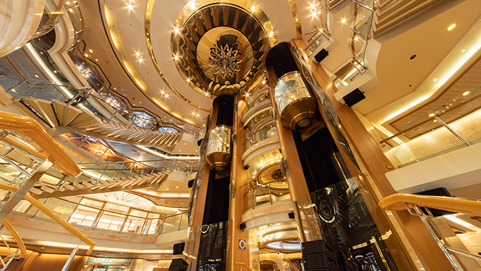 77,441トンの広い船内には、日用品やお菓子などが並ぶショップや320インチの巨大LEDスクリーンと2つプール、3つのジャグジーを備えたムービーズアンダーザスターズ、迫力ある映像を楽しめるシアターなど、世界一周クルーズをより充実したものにしてくれる施設が揃っています。そんなパシフィック・ワールド号の船内を、船上からクルーズディレクターの田村がレポートします。(詳しくはクルーズマガジン特別号をご覧ください)
