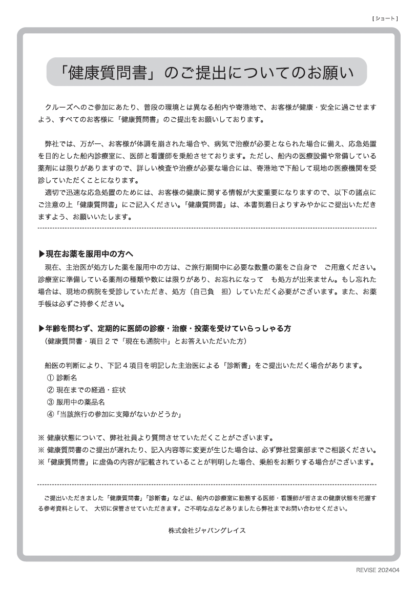 クルーズ出発にあたってご提出が必要な書類と渡航手続きのご案内です。