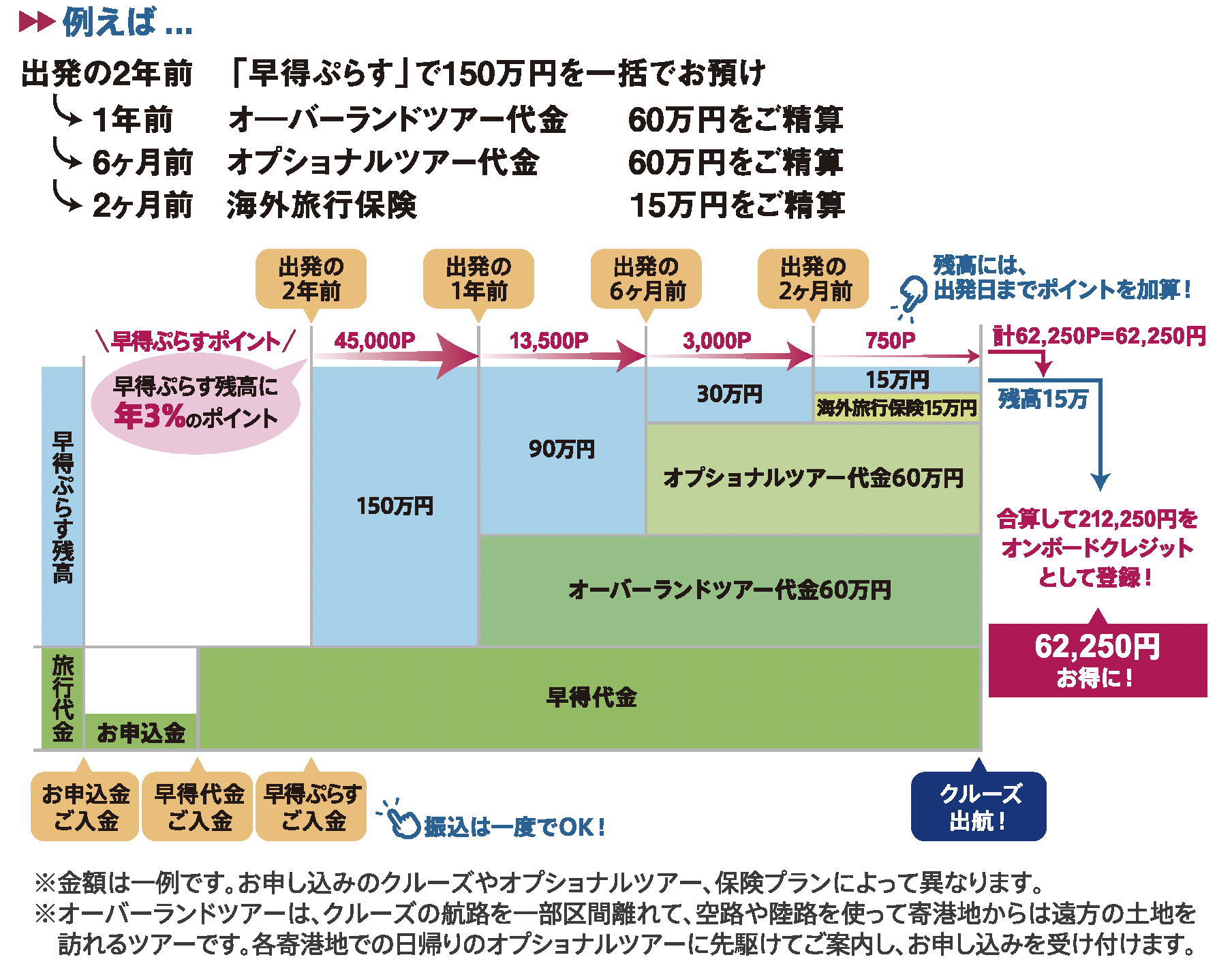 入金の翌日から、早得ぷらす残高に年3 %のポイントがつきます。ポイントは、すべての諸費用の精 算後も、出発日まで加算されますので、その分さらにお得にご乗船いただけます。