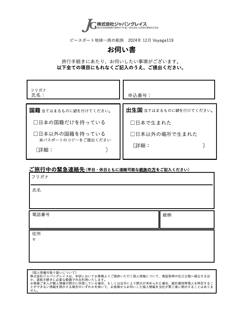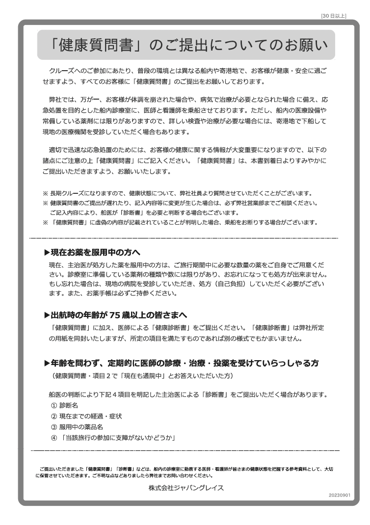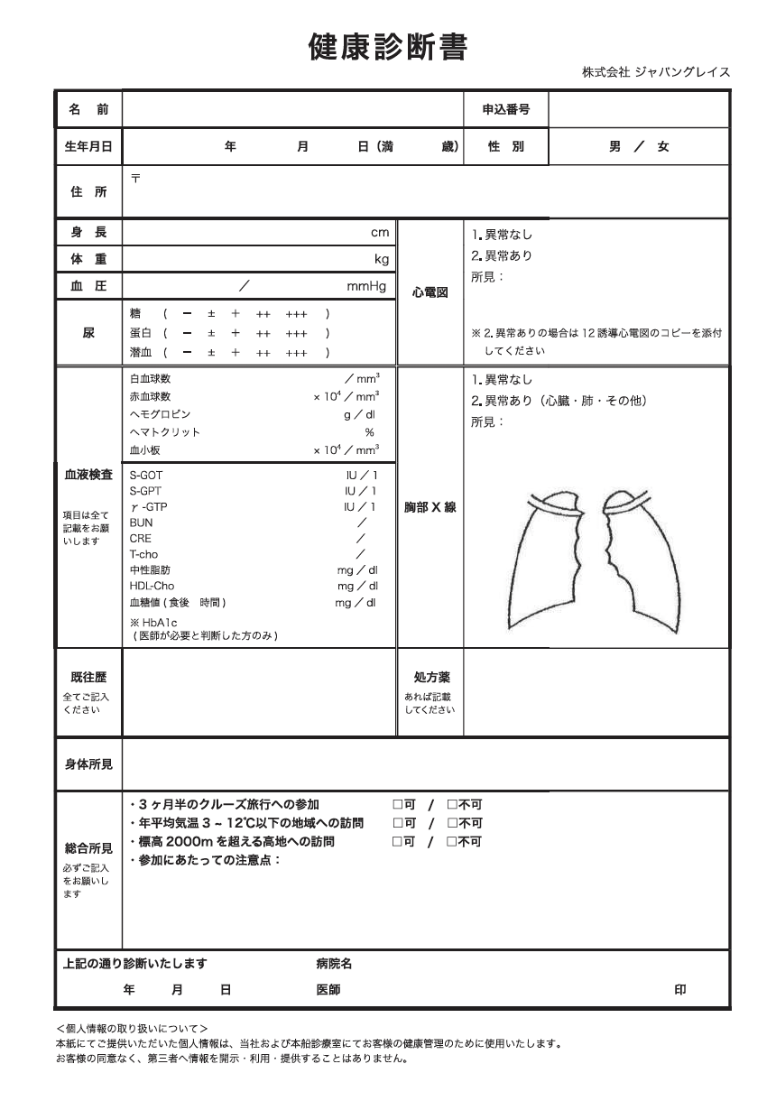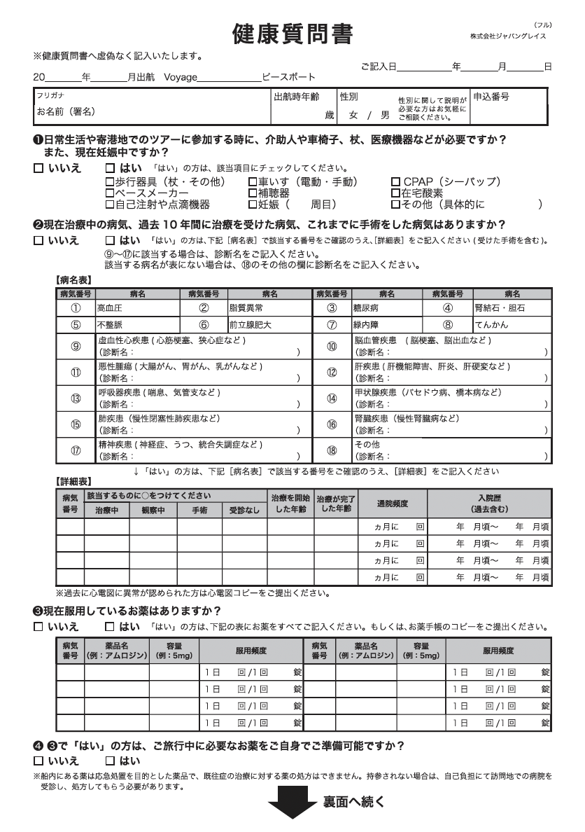 出航時の年齢が75歳以上の方は、「健康質問書」に加え、医師による「健康診断書」をご提出ください。「健康診断書」はこちらの用紙の項目を満たすものであれば、別の様式でもかまいません。