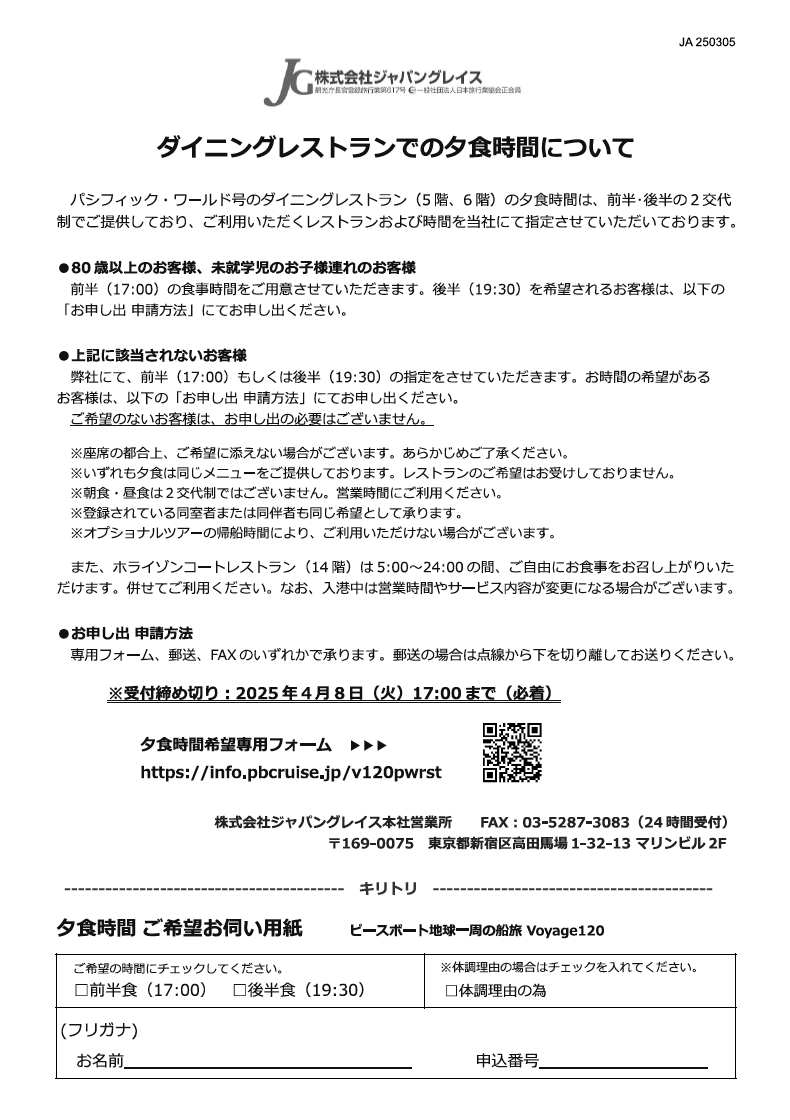 10:00更新 Voyage121 パシフィック・ワールド号 帰港時間遅延のご案内