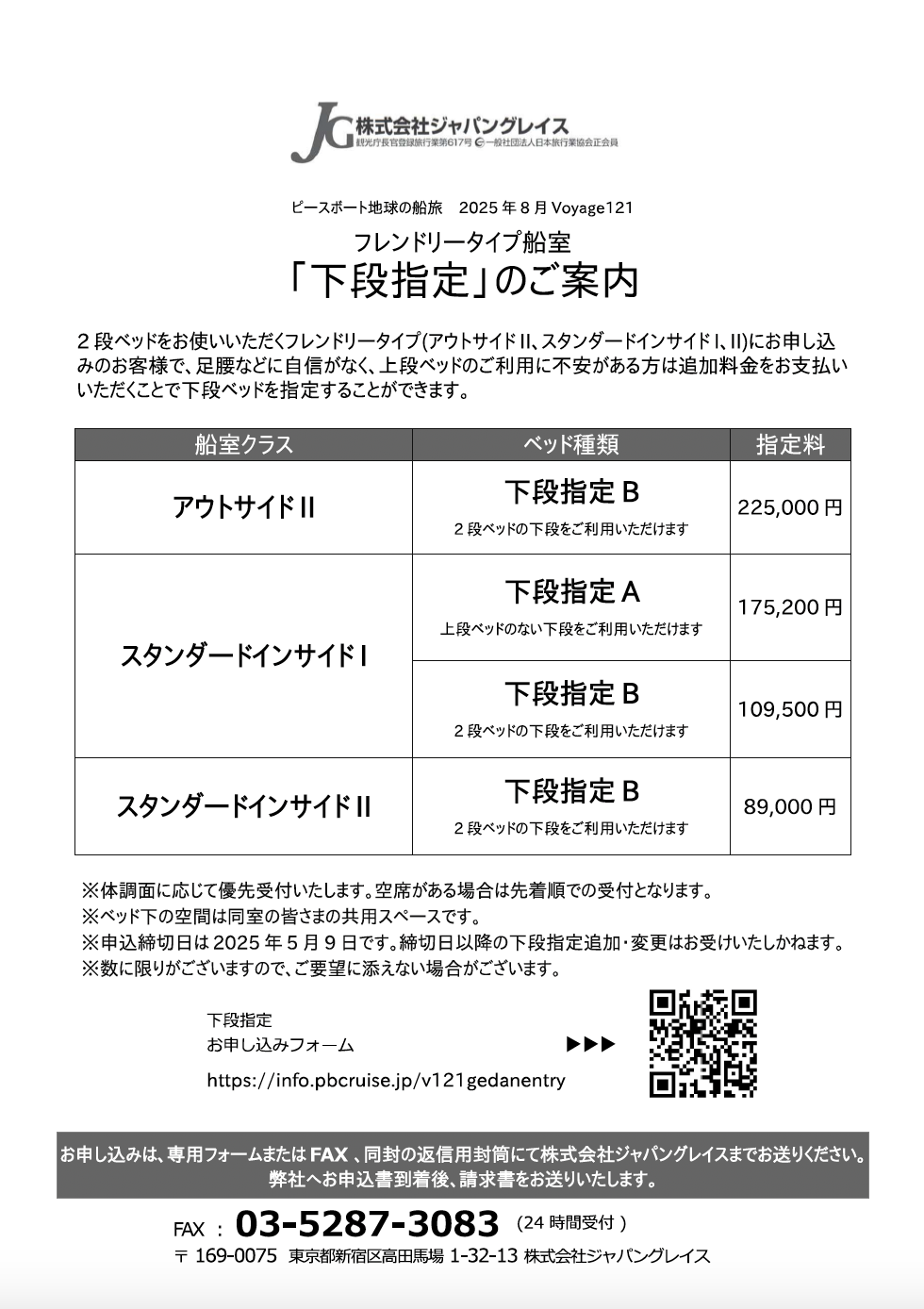 下段指定申込(フレンドリータイプ船室)