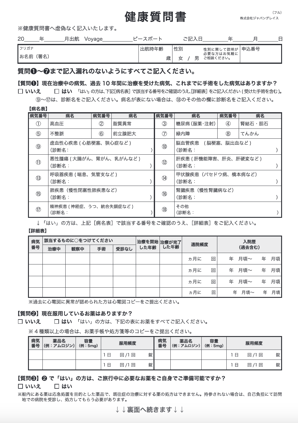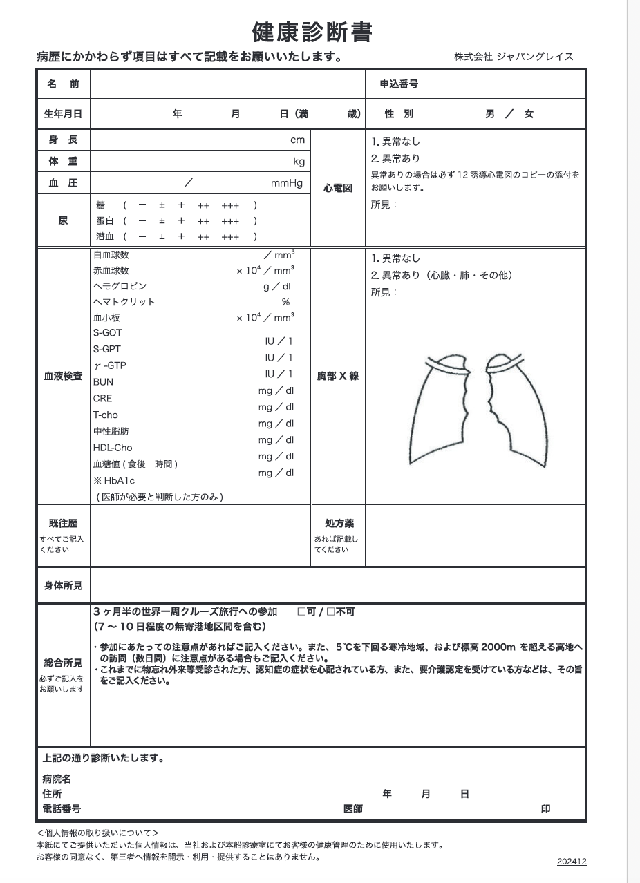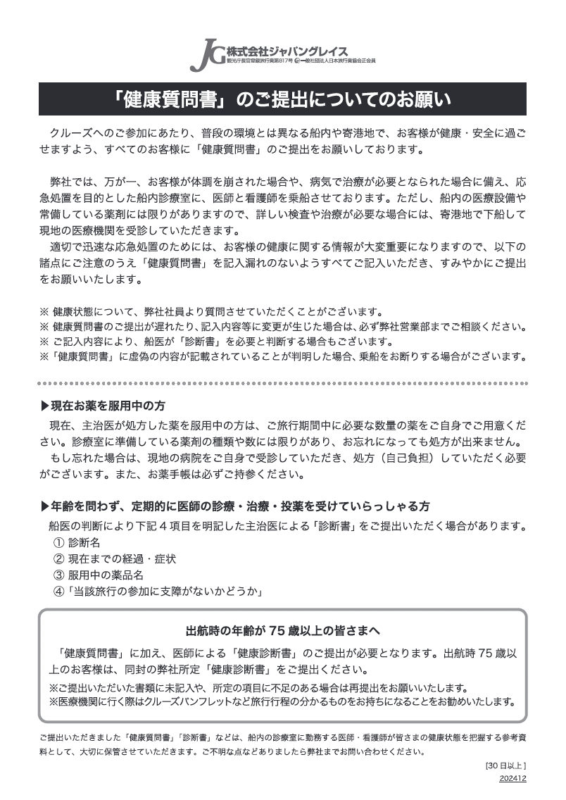 出航時の年齢が75歳以上の方は、「健康質問書」に加え、医師による「健康診断書」をご提出ください。