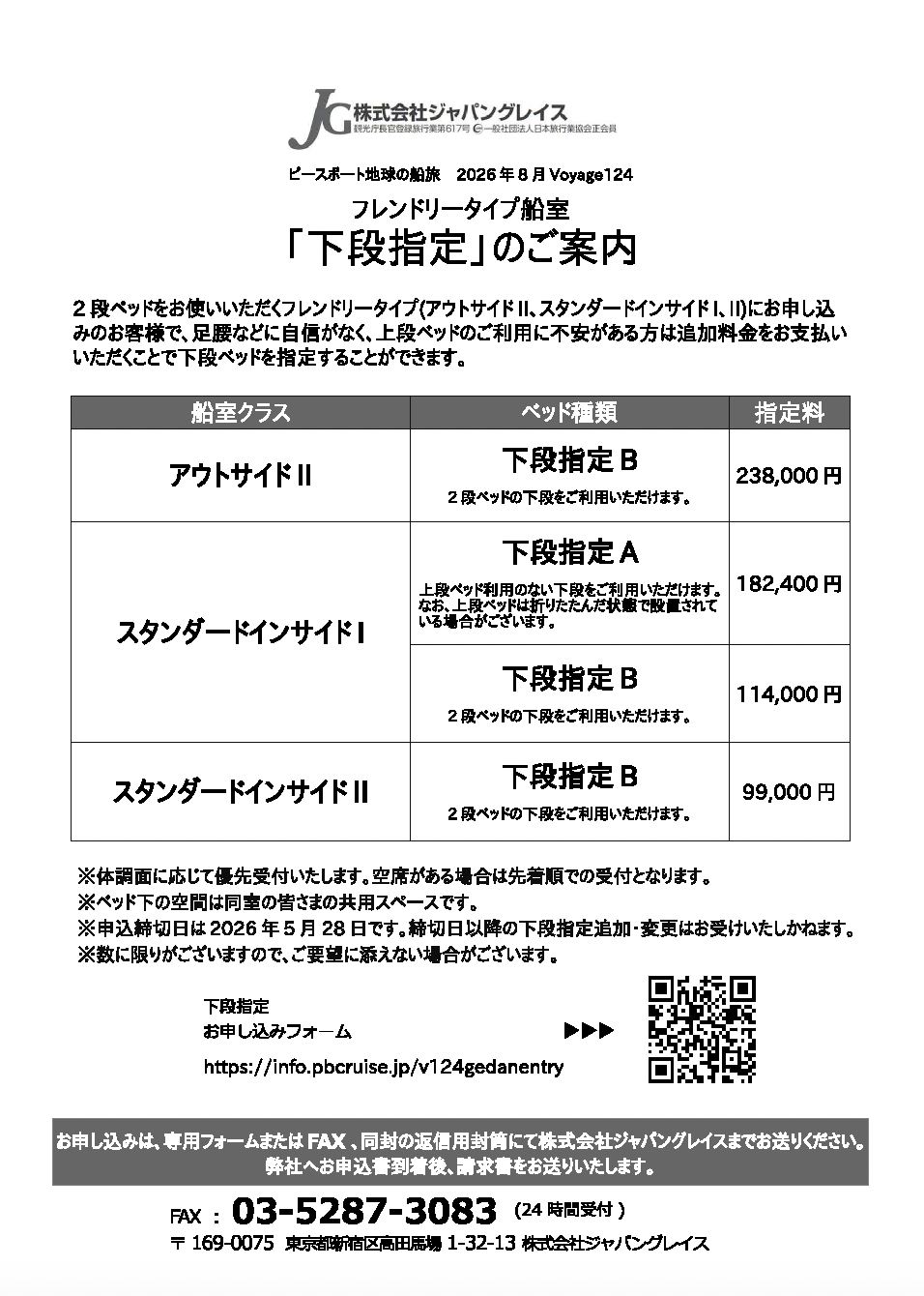 下段指定申込(フレンドリータイプ船室)