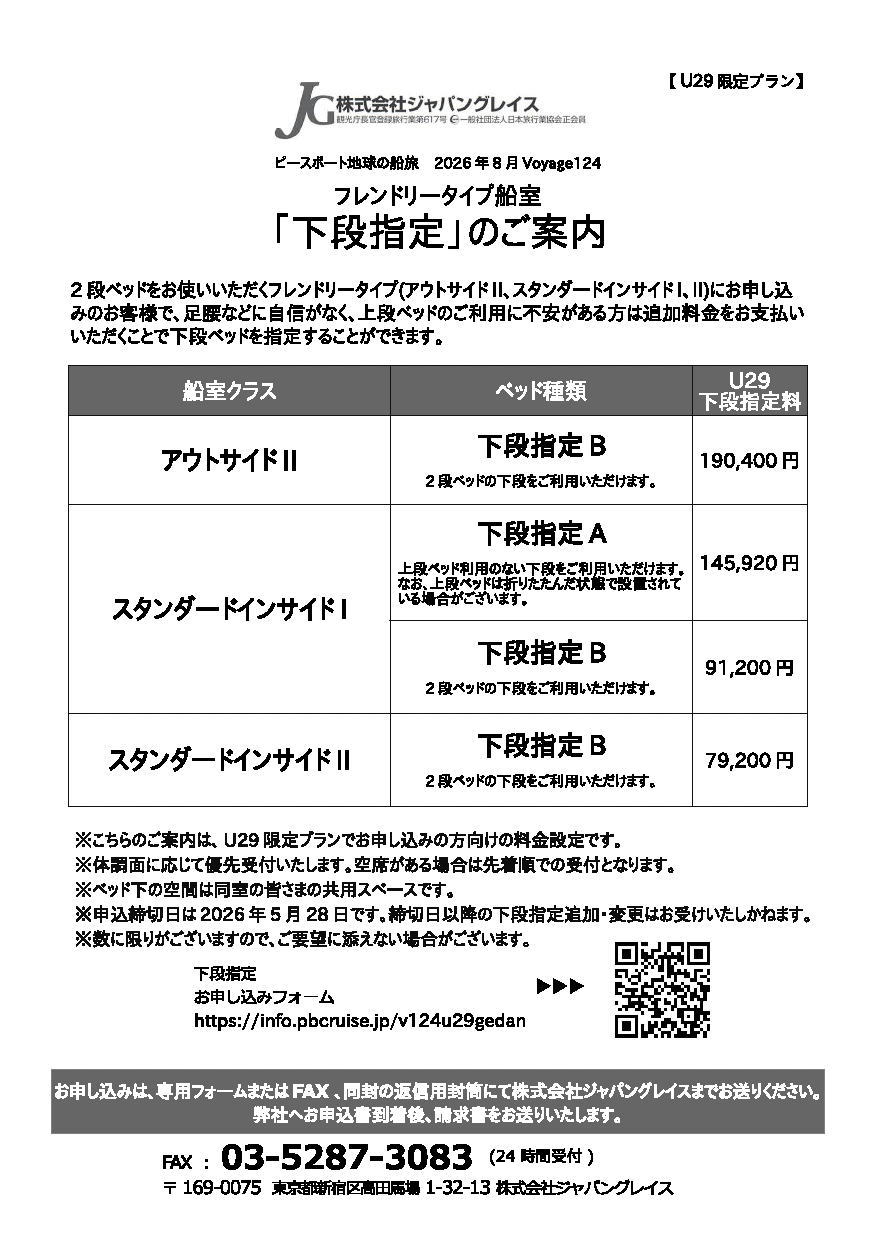 下段指定申込(フレンドリータイプ船室)【U29】