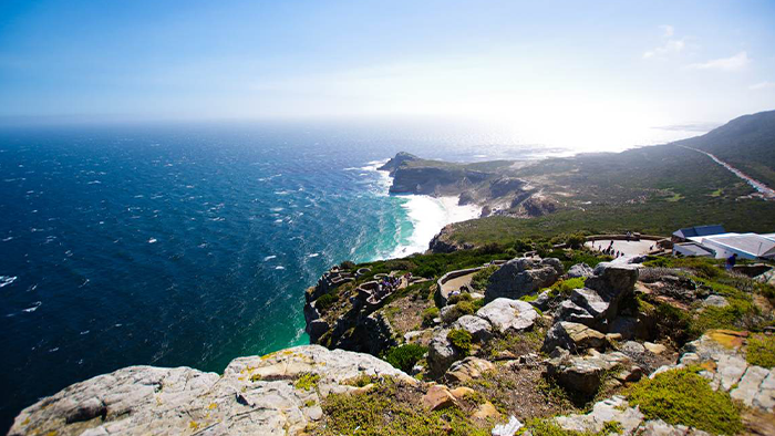 ゆっくりと港に近づいていくわたしたちを迎えてくれるのは、頂上がまるでナイフで切り取られたかのように平らなケープタウンの象徴的存在、テーブルマウンテンです。 ふもとには、 南アフリカの固有種を豊富に集めた「カーステンボッシュ国立植物園」があり、こちらもぜひ訪れたい場所です。 そして南アフリカを訪れたら一度はその地に立ってみたい場所、インド洋と大西洋の2つの大海が出会う「喜望峰」も外せません。かつての灯台があったケープポイントの展望スペースまであがると、そこから見えるのは喜望峰とどこまでも広がる大海原。まさに絶景です。
