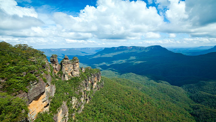 シドニー近郊に広がる神秘的な森、世界遺産のブルーマウンテンズへ。4,000kmに及ぶ広大な敷地内には、ユーカリの森が生い茂り、深い森に覆われた山並みに切り立った断崖絶壁が連なる雄大な景観がどこまでも広がります。ユーカリの木から蒸発する油分が太陽の光に反射して青く輝くことから、「ブルーマウンテンズ」という名が付きました。森を包むユーカリの爽やかな香りを楽しみながら、起伏に富んだ雄大な野山を歩けば、身も心も癒されることでしょう。清流が階段状の滝となって流れるルーラ・カスケードも楽しみです。