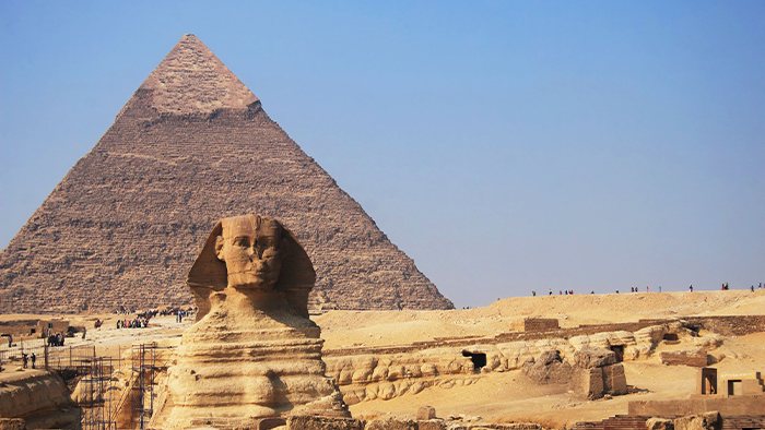 カイロ市街から南西へ向かうと、近代的な街並みの向こうにあのピラミッドの姿が見えてきます。テレビや写真で何度も観てきた憧れの世界遺産が、目の前にそびえ立つ喜びと不思議――。想像を超える大きさと建築精度の高さは、実物を前にするとより実感できます。さらには、その傍らに建つ巨大な石像・スフィンクスも、一枚の岩山から彫りだされたというから驚きです。クフ、カフラー、メンカウラーの三大ピラミッド、そしてスフィンクスが鎮座するギザの地は、4,500年の時を超えて訪れる人びとに、古代エジプトが抱く謎を投げかけ続けています。