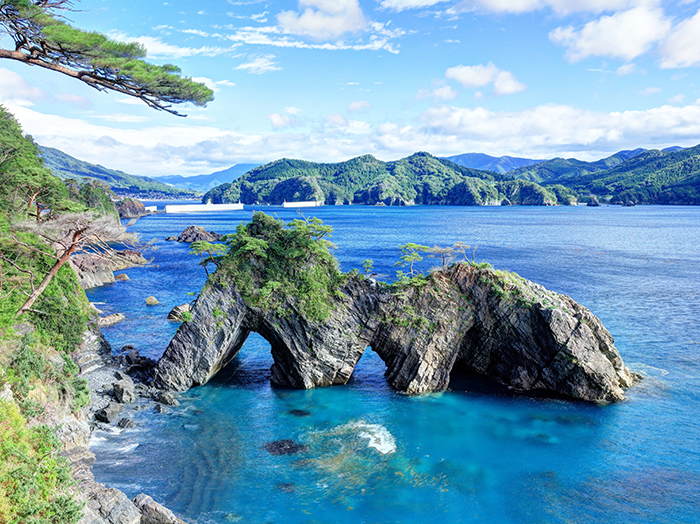 国の「名勝・天然記念物」に指定されているほか「日本の渚100選」にも選ばれている、碁石海岸。波で磨かれた黒い玉砂利が敷き詰められていることが、名前の由来になったという一説も。なかでも波の浸食により3つの大きな穴が開いた穴通磯(あなとおしいそ)は絶景スポットです。他にも、豪快な音が響き渡る雷岩や、切り立った岩壁が向かい合い白波が砕け散る乱曝谷(らんぼうや)なども見ごたえ十分。それらを含む島々を小型漁船でめぐる碁石海岸クルージングは、大船渡の自然を堪能できるアクティビティです。