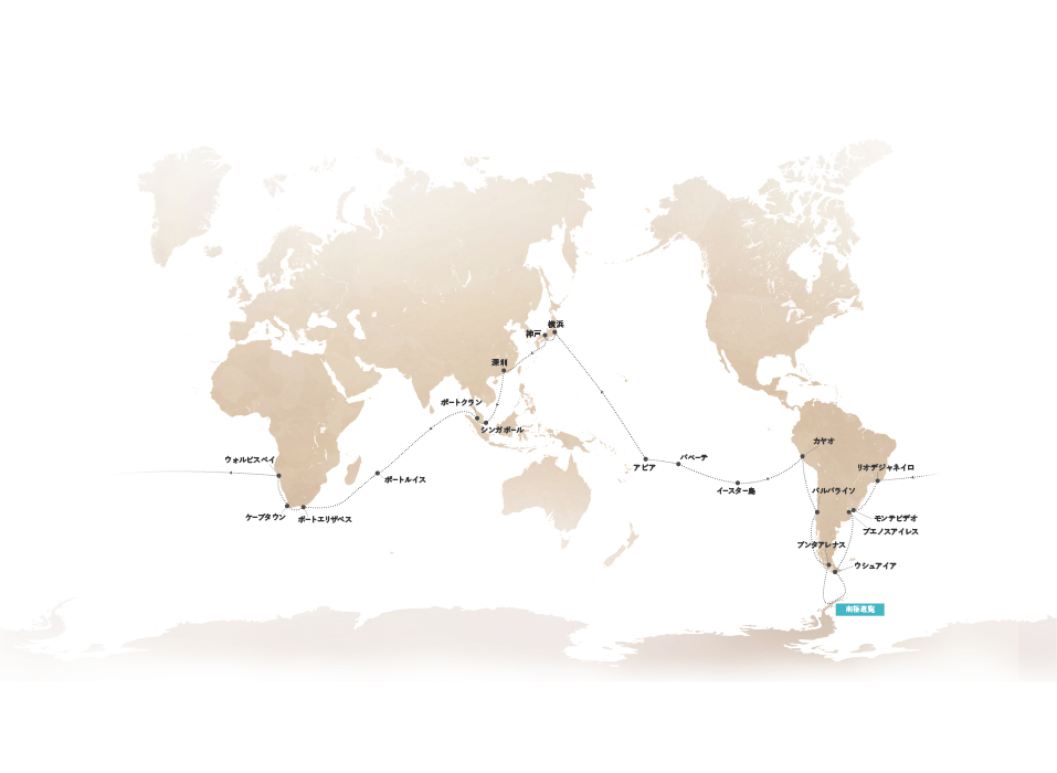 横浜 → 神戸 → 深圳(中国)→ シンガポール → ポートクラン(マレーシア)→ ポートルイス(モーリシャス)→ ポートエリザベス(南アフリカ)→ ケープタウン(南アフリカ)→ ウォルビスベイ(ナミビア)→ リオデジャネイロ(ブラジル)→ モンテビデオ(ウルグアイ)→ ブエノスアイレス(アルゼンチン)→ ウシュアイア(アルゼンチン)→ 南極遊覧 → プンタアレナス(チリ)→ バルパライソ(チリ)→ カヤオ(ペルー)→ イースター島(チリ)→ パペーテ(タヒチ)→ アピア(サモア)→ 横浜→ 神戸