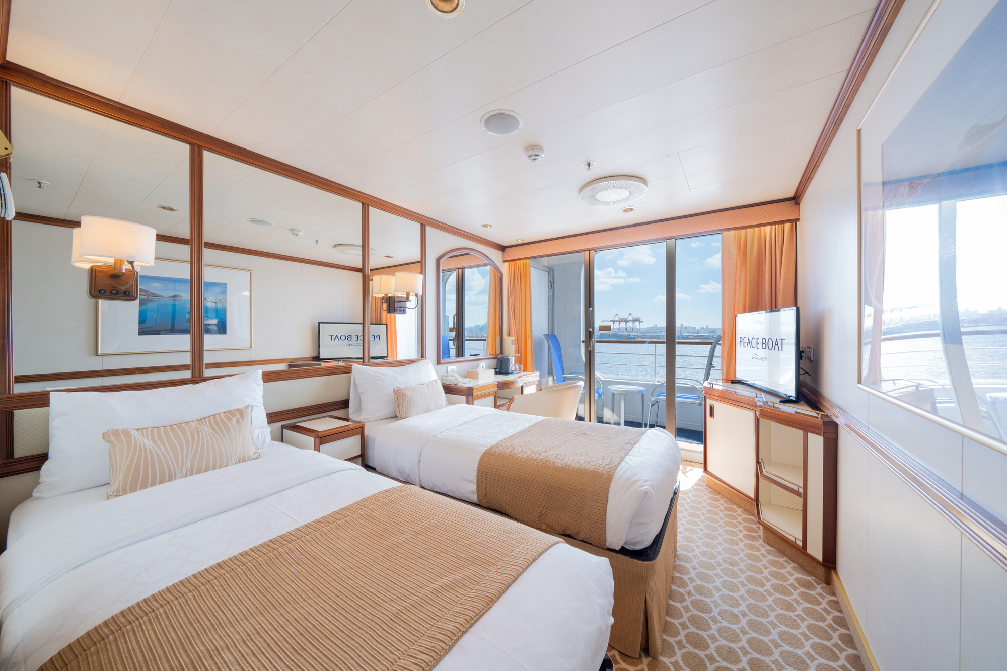 海をより近くに感じることのできるバルコニー付客室を豊富に備え、冷蔵庫やミニバーをご利用いただけるお部屋も揃えています。こちらに掲載した以外にも、ジュニアスイートやバジェットなど、さまざまなタイプのお部屋をご用意しております。船内での過ごし方やご旅行人数、ご予算に合わせてお選びください。旅行代金には、全日程分の各国への移動費、お食事や宿泊費なども含まれた料金設定になっています。