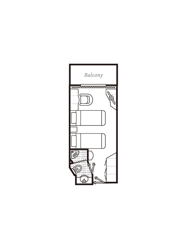 リビング、ベッドとエリアが分かれ、プライベートバルコニーがついた、海の風を感じる開放感のある船室です。
