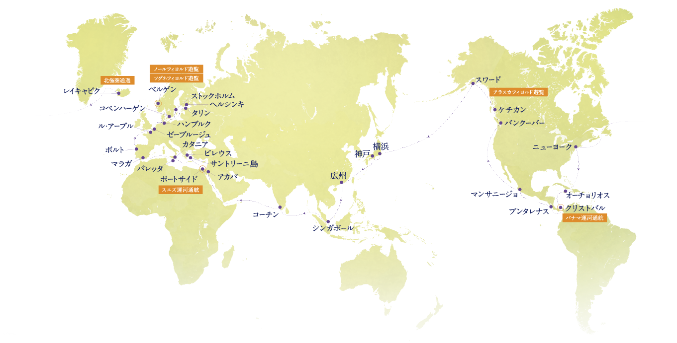 横浜 → 神戸 → 広州(中国) → シンガポール → コーチン(インド) → アカバ(ヨルダン) → スエズ運河通航 → ポートサイド(エジプト) → サントリーニ島(ギリシャ) → ピレウス(ギリシャ) → カタニア(イタリア) → バレッタ(マルタ) → マラガ(スペイン) → ポルト(ポルトガル) → ル・アーブル(フランス) → ゼーブルージュ(ベルギー) → ハンブルク(ドイツ) → ストックホルム(スウェーデン) → タリン(エストニア) → ヘルシンキ(フィンランド) → コペンハーゲン(デンマーク) → ベルゲン(ノルウェー) → ソグネフィヨルド遊覧 → ノールフィヨルド遊覧 → レイキャビク(アイスランド) → 北極圏通過 → ニューヨーク(米国) → オーチョリオス(ジャマイカ) → クリストバル(パナマ) → パナマ運河通航 → プンタレナス(コスタリカ) → マンサニージョ(メキシコ) → バンクーバー(カナダ) → ケチカン(米国) → アラスカフィヨルド遊覧 → スワード(米国) → 横浜 → 神戸