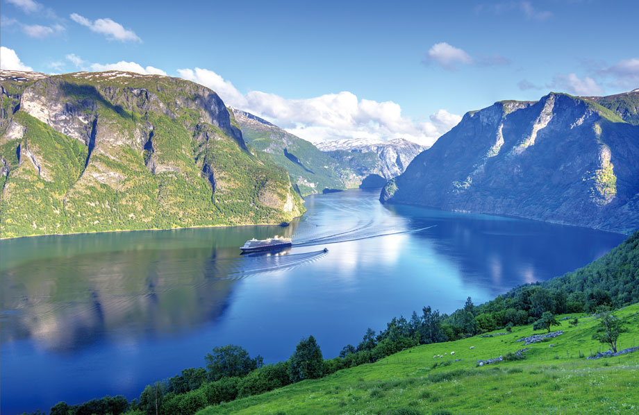 初夏のソグネフィヨルドは、美しい緑と青い水面との共演。氷河による浸食作用によって形成された複雑な地形が、神秘的な自然美を誇ります。地球が数十万年の時間をかけて作り上げたこの美しさは、船で訪れるからこそ堪能できる景色です。