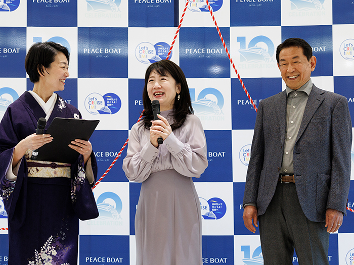 メモリアルゲストによるスピーチでは、記念すべき10万人目の乗船者となられました園田深雪さん・博史さんご夫妻が壇上にあがられました。「ピースボートクルーズは初乗船で、海外旅行も10年ぶりなので、今は本当にわくわくした気持ちでいっぱいです。寄港地はもちろん、船内での生活やいろいろな方との出会い、たくさんの景色を見られることも楽しみです。」と、旅を前にした心境を笑顔で語ってくださいました。また、10万人達成を祝したくす玉割りが行われたほか、記念品として世界にひとつだけの「10万人達成記念メモリアル・プレート」などが贈呈され、会場はお祝いムードに包まれました。