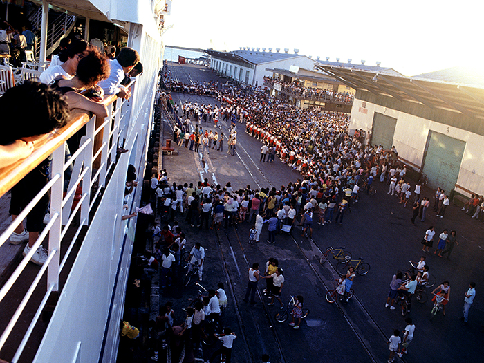 写真:1990年、ピースボート初の地球一周の船旅で寄港したコリント港(ニカラグア)では8,000人の人びとが港に集まり、寄港を出迎えてくれました
