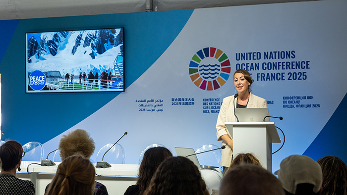 2025年6月、第3回国連海洋会議(UNOC3)がフランスとコスタリカの共催で開催され、各国首脳を含む約1万5,000人がニースに集結しました。この会議に、NGOピースボートの代表も参加。国連の公式サイドイベント「ブルーゾーン」にて登壇し、海洋汚染や気候変動といった地球規模の課題に取り組む「SDGsユースプログラム※」の活動や、2025年1月に成功をおさめた南極航路のクルーズについて報告しました。