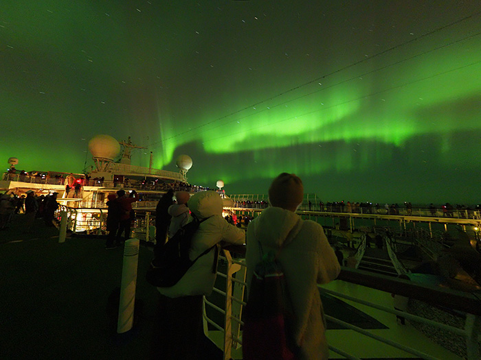 「素晴らしい見応えでした。しかも背後には氷河も火山もありました」オーロラの出現を、寒い屋外で待ち続ける必要がないことも、クルーズでオーロラ観測をするメリットです。オーロラが現れるまで、船内でゆっくりと待つことができます。オーロラが出現したら、船内放送でアナウンスが流れてくるのです。