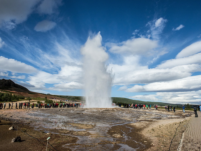 アイスランドの驚異的な自然は、地表からも姿を現します。間欠泉を訪れれば、少しずつ水面が揺らぎ膨張したあと、およそ4~8分間隔で轟音とともに水しぶきが噴き上がる様子が見られます。ポコポコと動く水の姿は、地球の呼吸そのもの。氷河の溶解水が地表近くのマグマだまりで温められ、高温となった熱水が一気に噴き上がる光景は圧巻です。