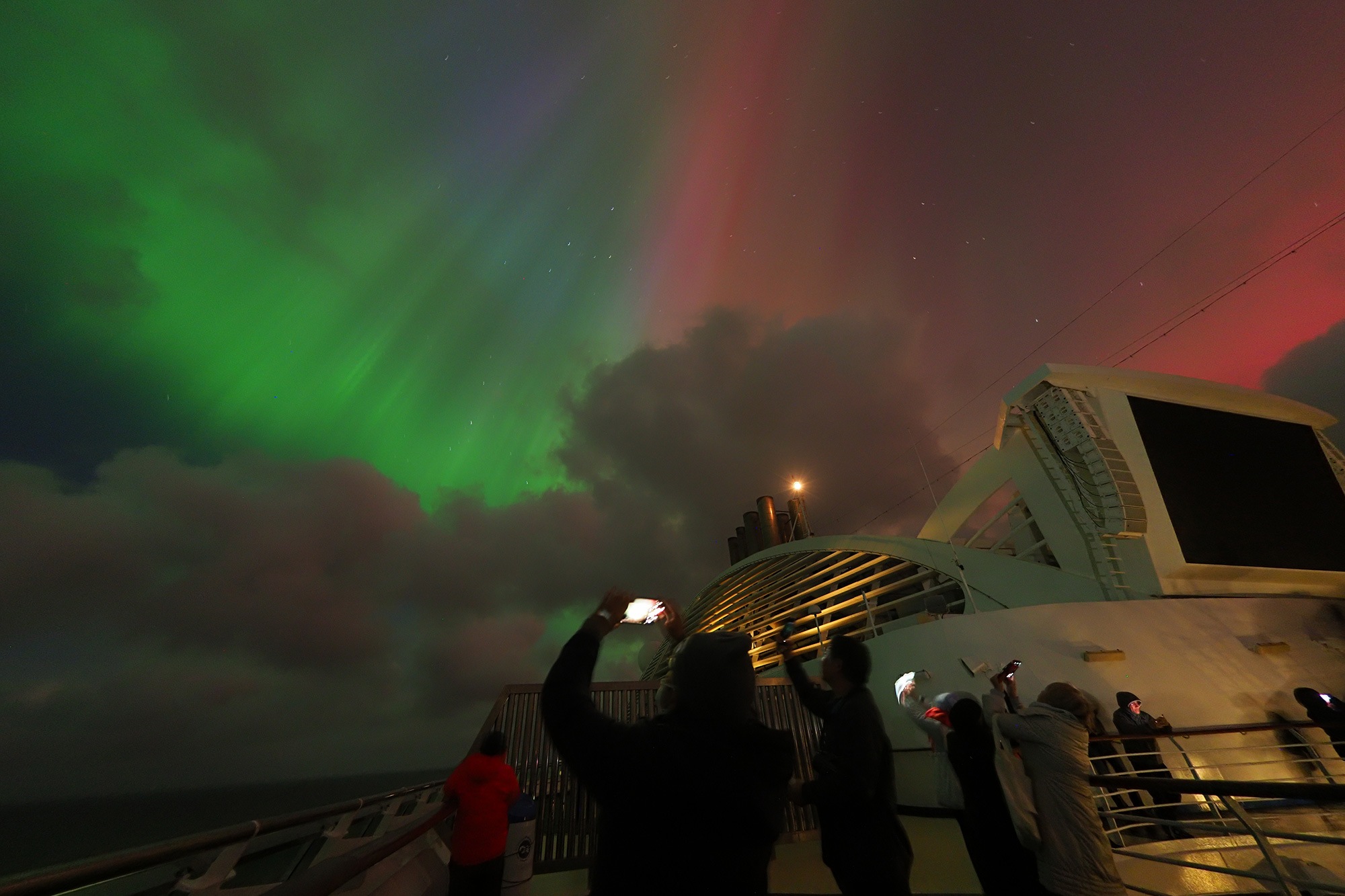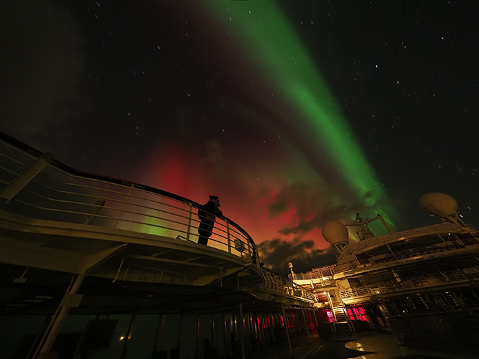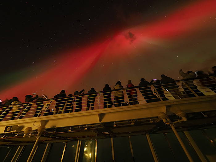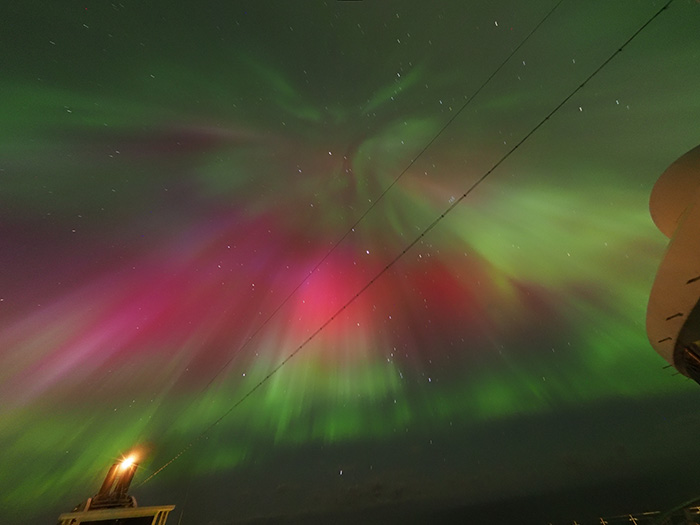 船上での観測時、デッキで待機していた私は、海面が山火事かと思うほど赤く染まる光景を目にしました。やがて段々と空の上部にも光が広がり、緑色のカーテン状のオーロラに変わっていきました。天頂付近から真一文字の緑のオーロラが現れたときは、幅を広げながらゆっくりと開き、赤やピンクといったさまざまな色の光が空を彩りました。すごいですよ、一晩中見えてるんですからね。オーロラがこちらに向かってくるようで、まるで“オーロラ浴”とでもよびたくなるような体験でした。もちろん写真もたくさん撮りましたし、今はスマートフォンも性能がいいですから、十分に美しい写真が撮れますよ。