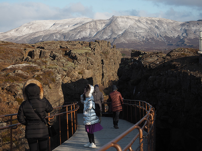 地球の表面を覆う巨大なプレートは、通常は深海にあるもの。しかしアイスランドには世界で唯一、プレートが地表に表出した場所があり、“地球の割れ目”を意味する「ギャオ」とよばれています。ユーラシアプレートと北米プレートが左右に引き合う割れ目であるギャオは、今も年に数センチずつ引き離されていて、まさに動いている地球が感じられる場所です。