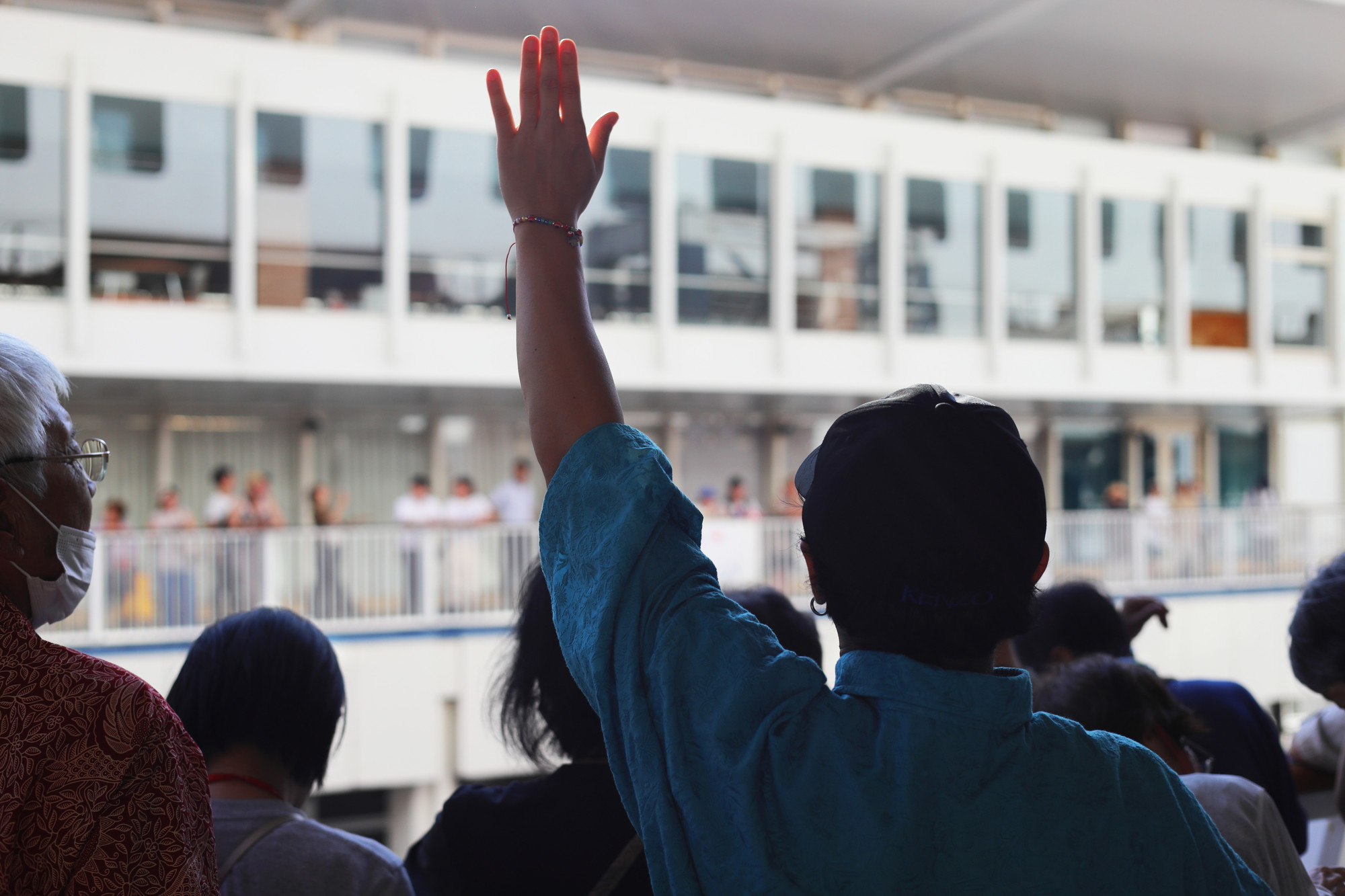 船に乗り込み、はやる気持ちを抑えてデッキに出ると、そこには声の届く距離でお見送りの人びとの笑顔が見えます。出港時刻が迫ると、ターミナルは船の出航を見送る人びとで埋め尽くされ、見送る人も見送られる人も、思い思いに手を振ります。船側と陸側で掛け合いながらの「出航式」の華やかさも、ピースボートクルーズの特徴のひとつ。出航式では、本船キャプテンよる出航の挨拶や乗船者の方々によるスピーチが行われます。記念すべき出航の時をともに祝おうと、船のデッキにはたくさんの方が集まります。