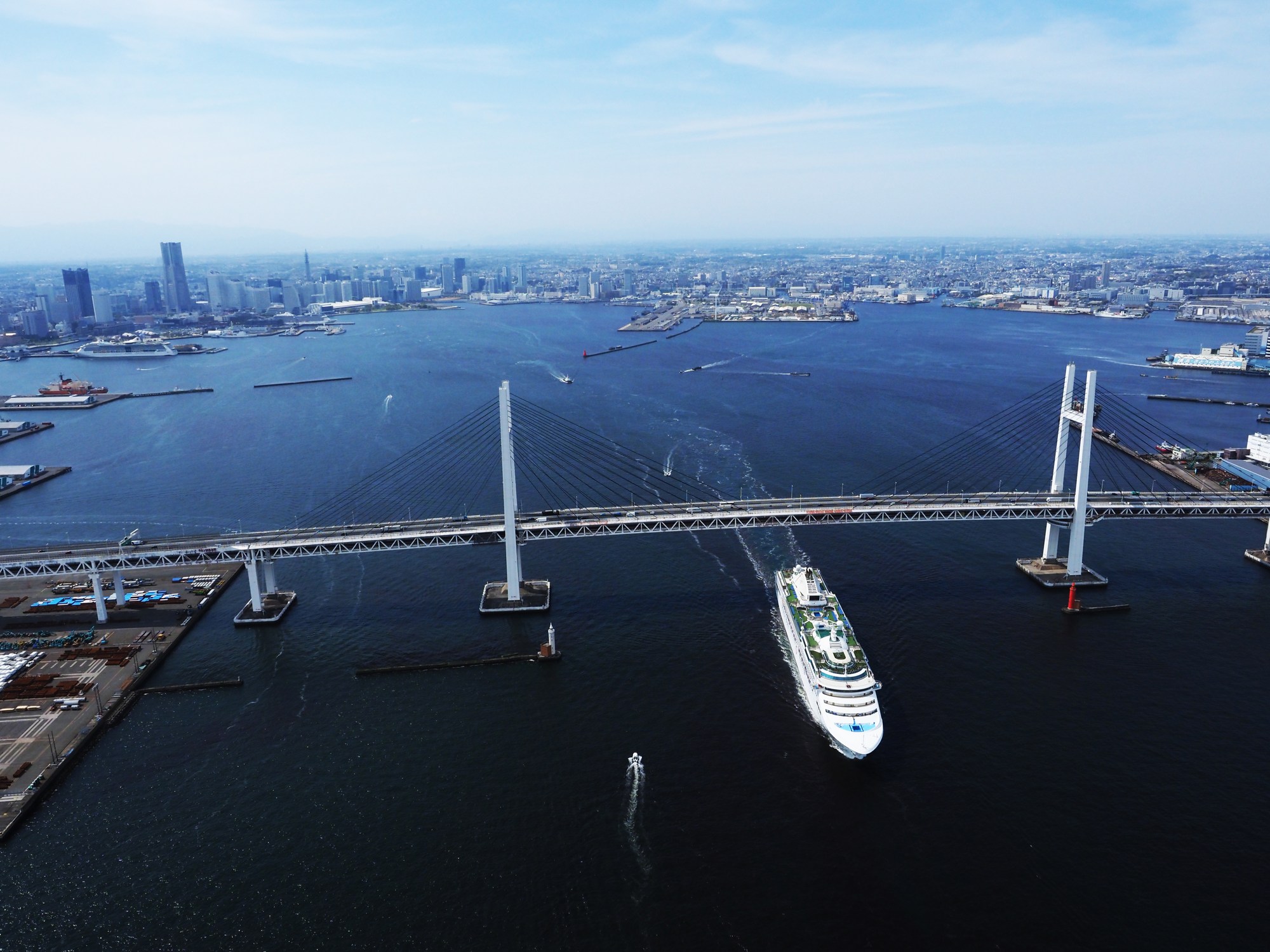 出港の時を告げる汽笛がなり響き、ゆっくりと岸壁から離れていく船。船とターミナルを行き交う「行ってきまーす」、「行ってらっしゃーい」という声が、次第に遠ざかっていきます。さあ、いよいよ夢にみた世界一周の旅がはじまります。そのスタートラインとなるのは、横浜港にかかるベイブリッジ。世界一周を終える日には、ここがゴールラインへと変わります。