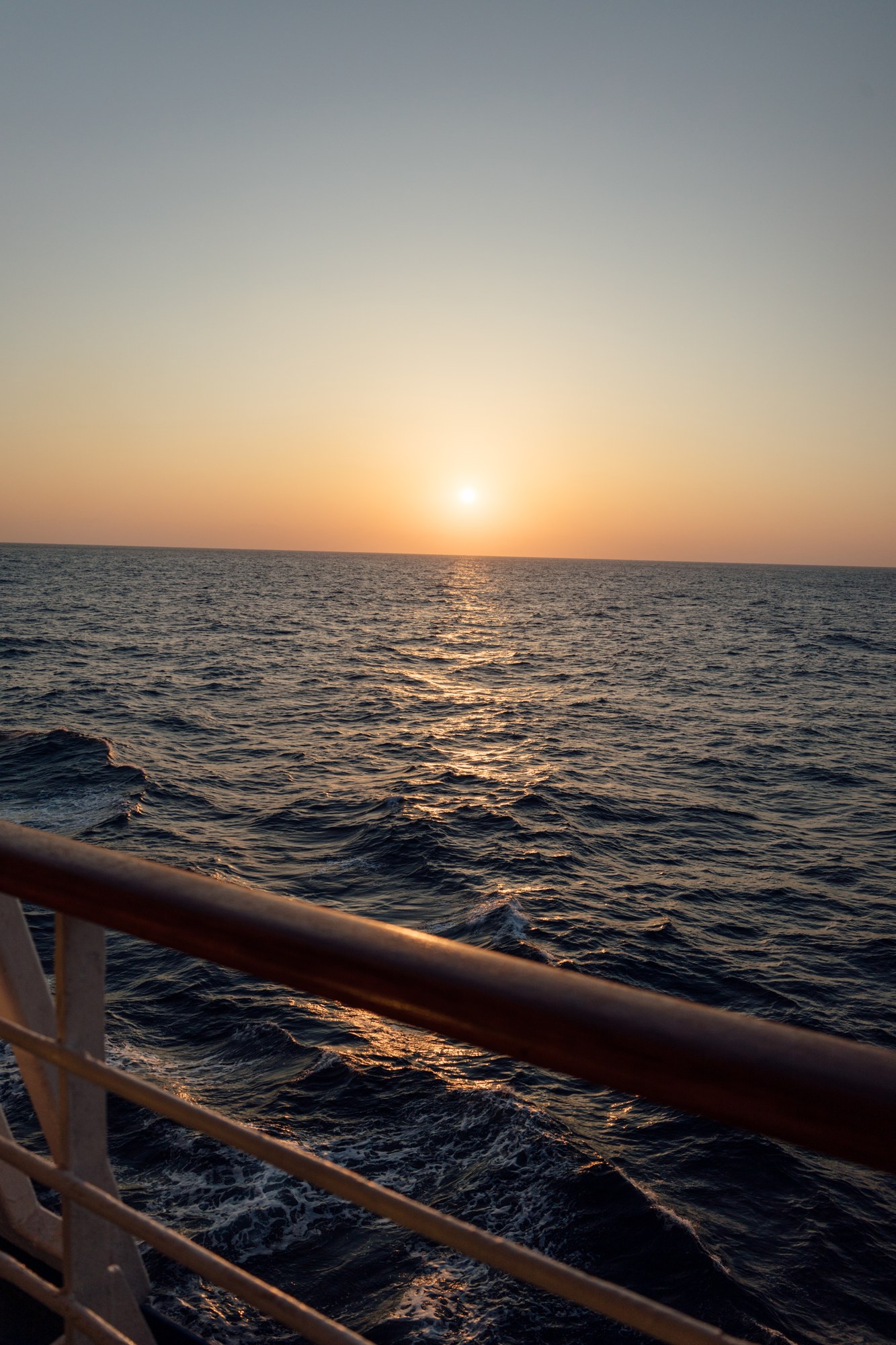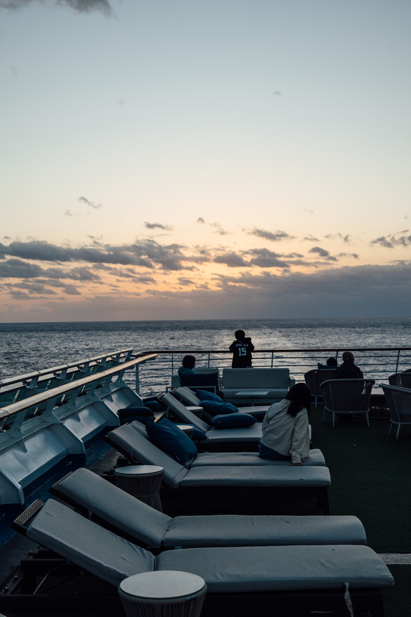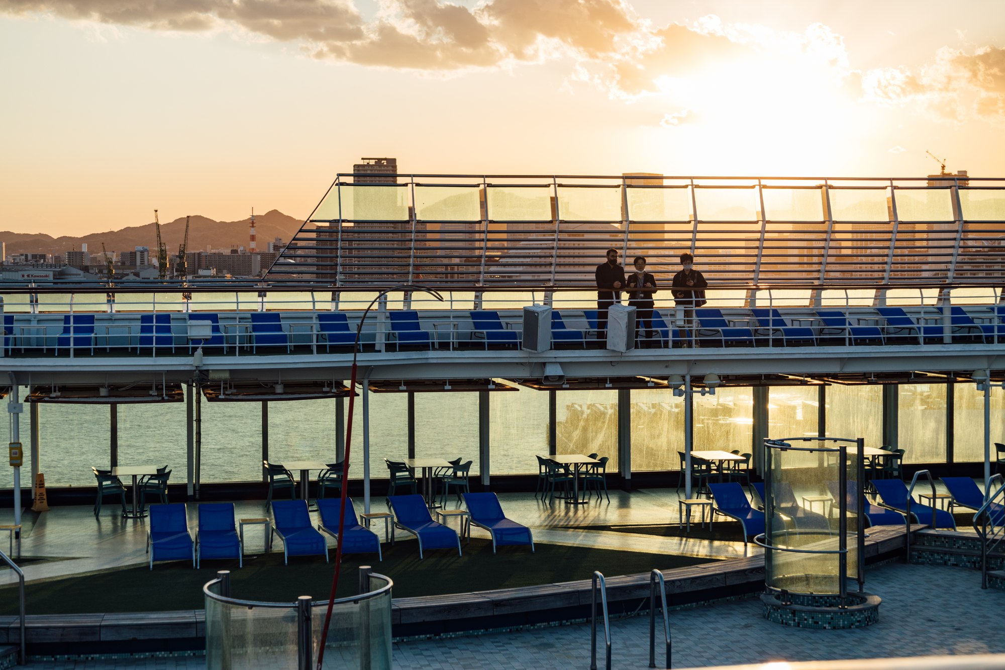 夕暮れ時になると、多くの人の足が自然とデッキへ向かいます。外に出てみると、そこには美しい夕日が待っていました。海に沈む夕陽は吸いこまれそうなほど美しく、神秘的なグラデーションを描きます。初めはふんわりとやわらかな夕焼けがだんだんと炎のような赤色に変わり、水平線にとけていく――ゆっくりと時間をかけながら海へと消える太陽を見ていると、「ぜいたくだねぇ……」。そんなつぶやきが、いくつも聞こえてきます。ゆっくりと、しかし確実に水平線の彼方へと沈んでゆく太陽に別れを告げます。