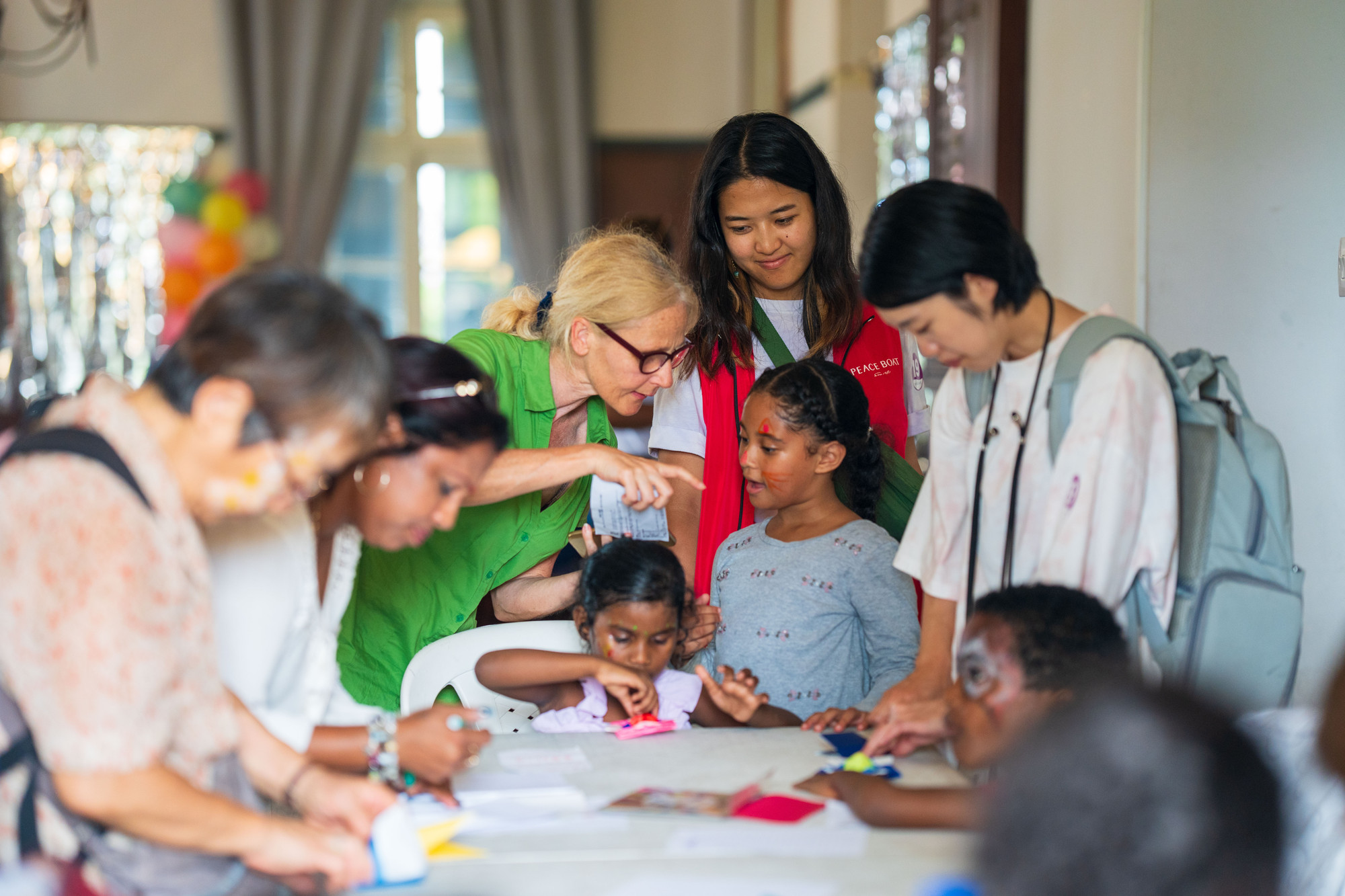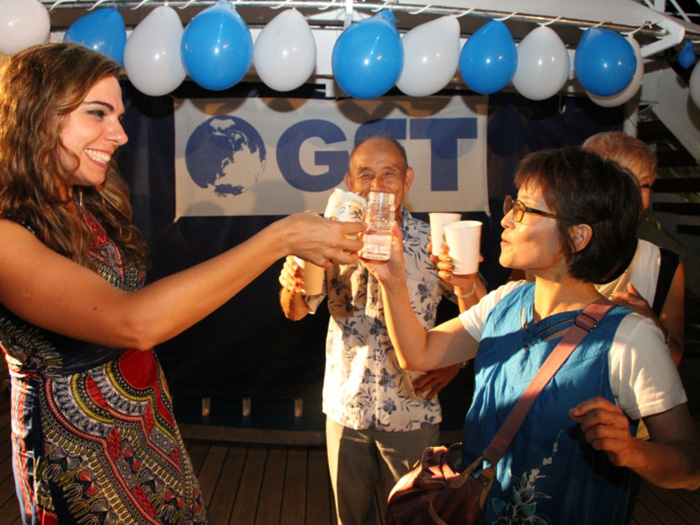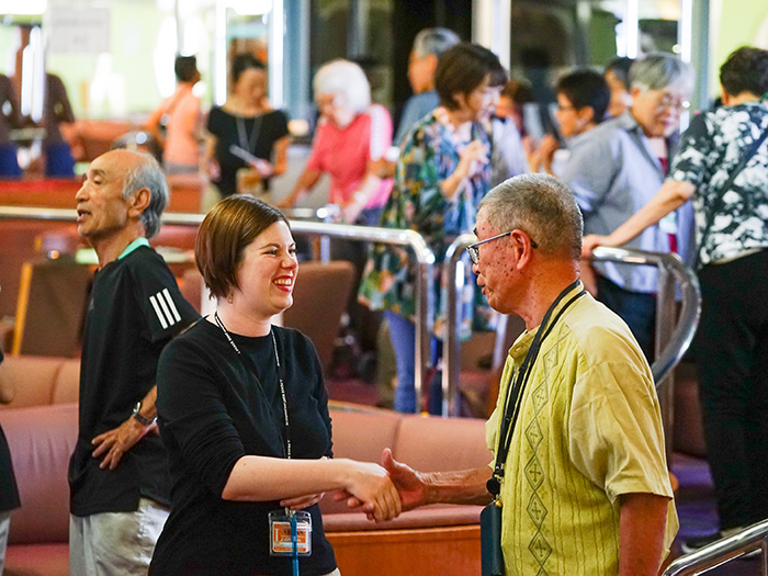 さまざまな文化圏で暮らす人びとが集うピースボートクルーズは、まさに世界の縮図のような場。海外ゲストやクルー(乗組員)も含めると、世界30ヶ国以上の人びとがひとつの船に集います。同じ言語を話すコミュニティーで楽しむこともできますが、せっかくなら言語を越えて交友の輪をひろげてみたいもの。多様性のある英語のことを、ピースボートでは「グローバル・イングリッシュ」と呼び、さまざまな「英語」を使ってのコミュニケーションを楽しみます。旅の中で身につけた英語を使えば、現地での交流も一層深まるでしょう。