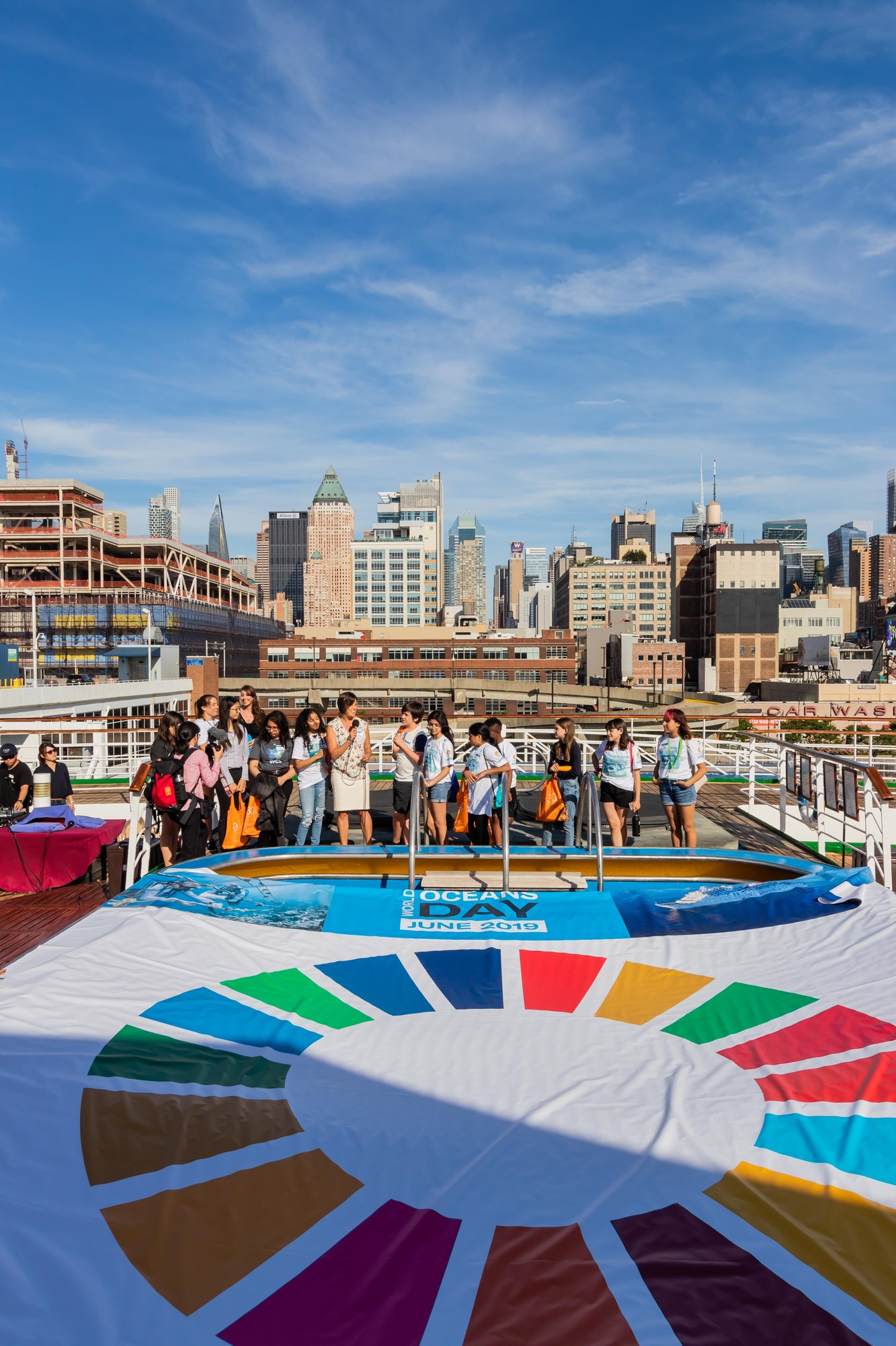 ニューヨーク寄港時には船上で、SDGsに関するイベントを開催し、国連関係者など多数のゲストを招待しています。2019年には、船上で「世界海洋デー」を記念する国連公式イベントを開催し、国連事務次長(法務担当)が来船。当日はピースボートの活動紹介やオーシャンユースによるプレゼンテーションが行われました。さらに『海』や『パートナーシップ』についての基調演説やディスカッションにより、環境問題に関する最前線の取り組みや課題を、実際に船の上で知ることができる貴重な体験となりました。
