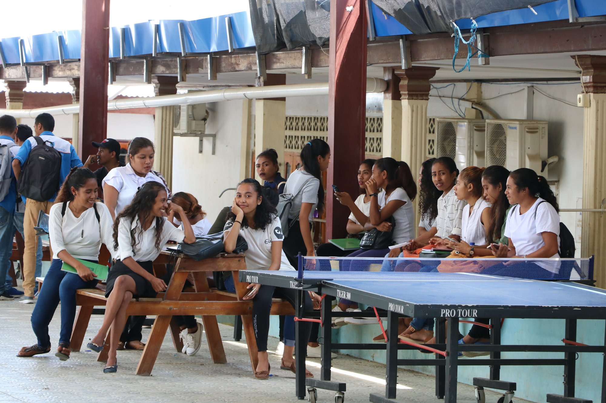 東ティモールは国民の約7割が30歳以下と、若さとエネルギーに満ちた国。この国の未来を担う若者たちとの出会いも大きな楽しみ。港からバスに乗って訪れたのは、独立と同じ2002年に設立されたディリ工科大学です。大学のキャンパスに入ると歓迎の印として、東ティモールの伝統的な織物「タイス」を一人ひとりの首にかけてくれました。